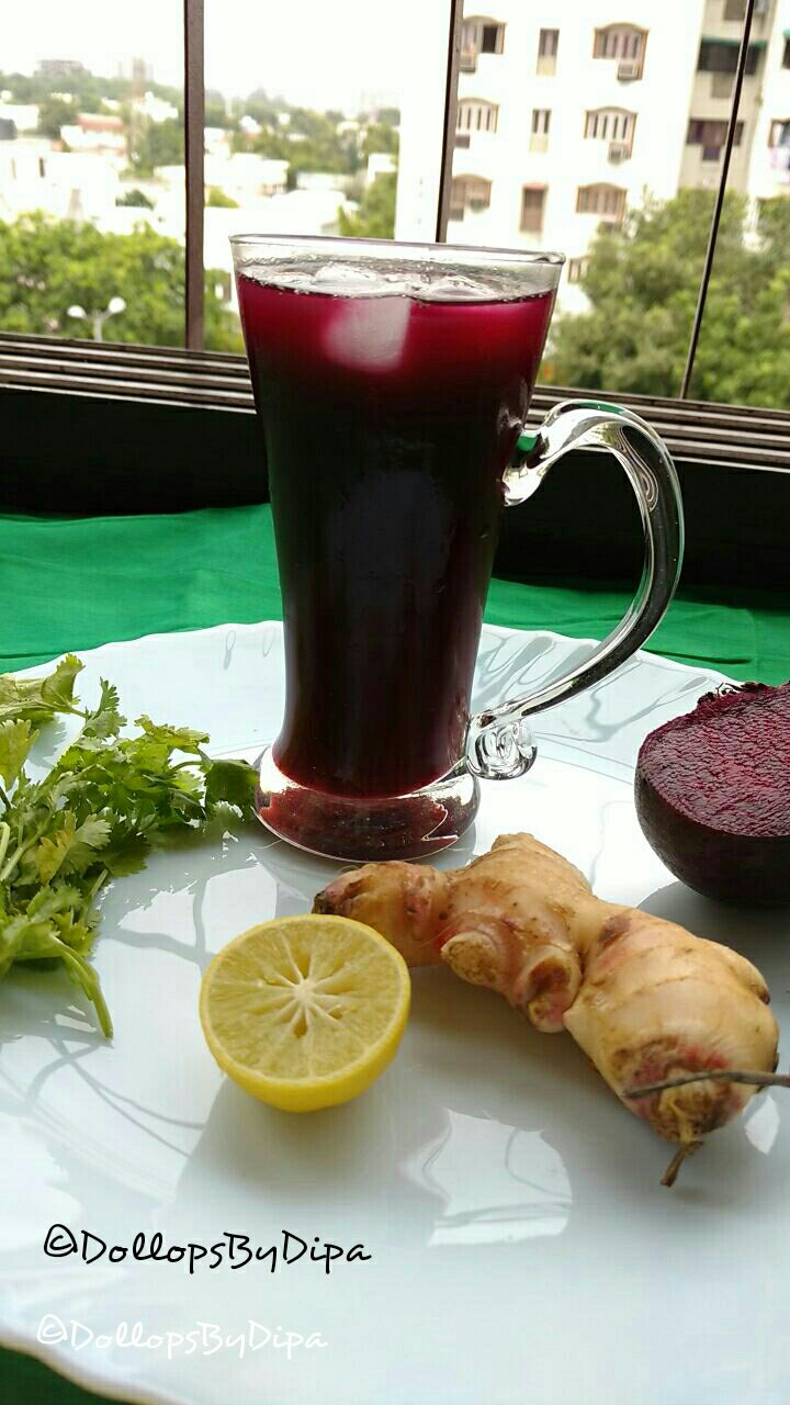 This healthy cooler contains beet- good for hemoglobin, coriander – good for eyes, ginger – good for digestion , lemon – good source for vitamin C.. All in all this yummy drink is total health pack in this season.