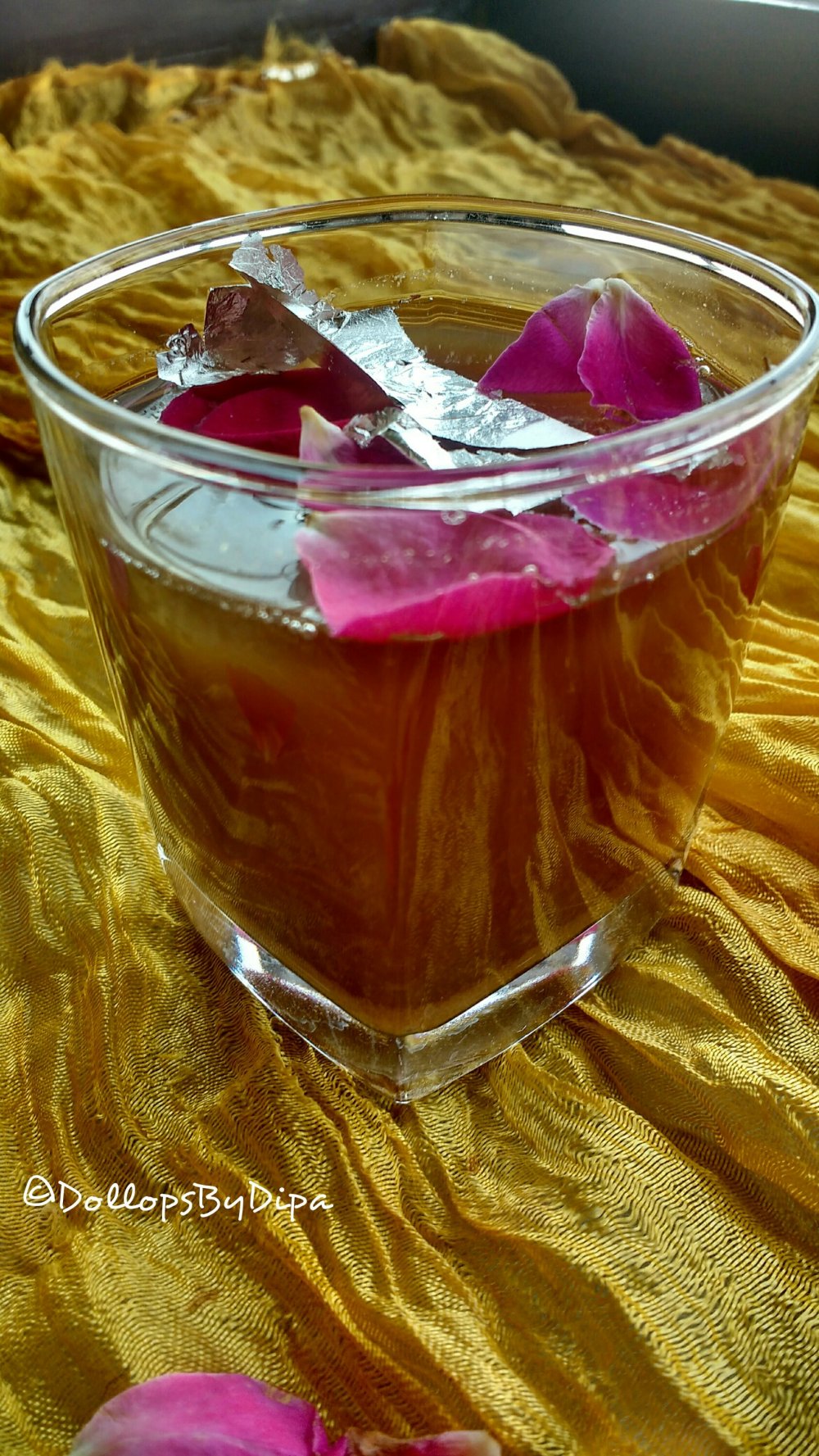 4. At the time of serving, add crushed ice, few rose petals & pour chilled cooler & top up with little silver leaf & serve.