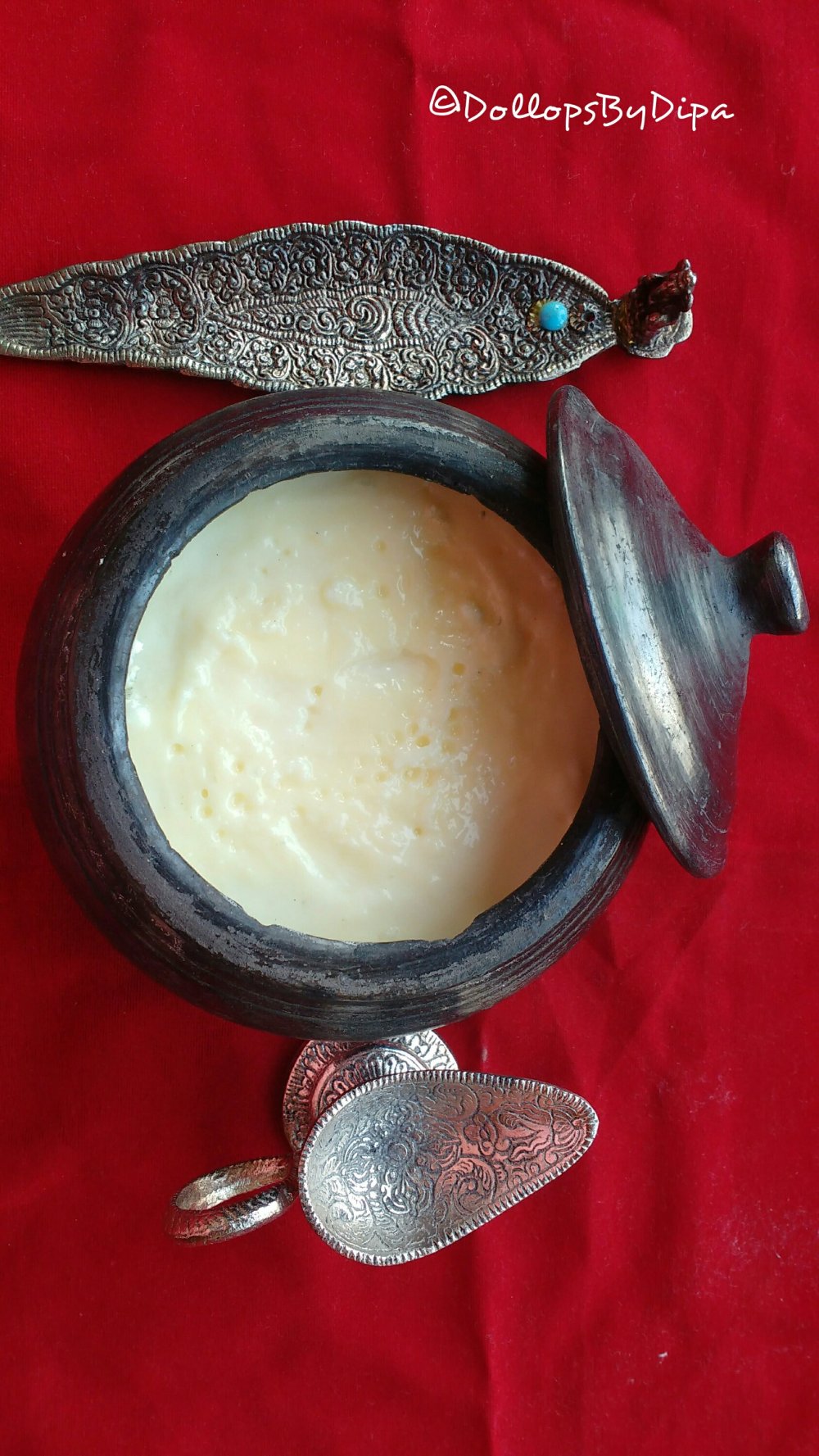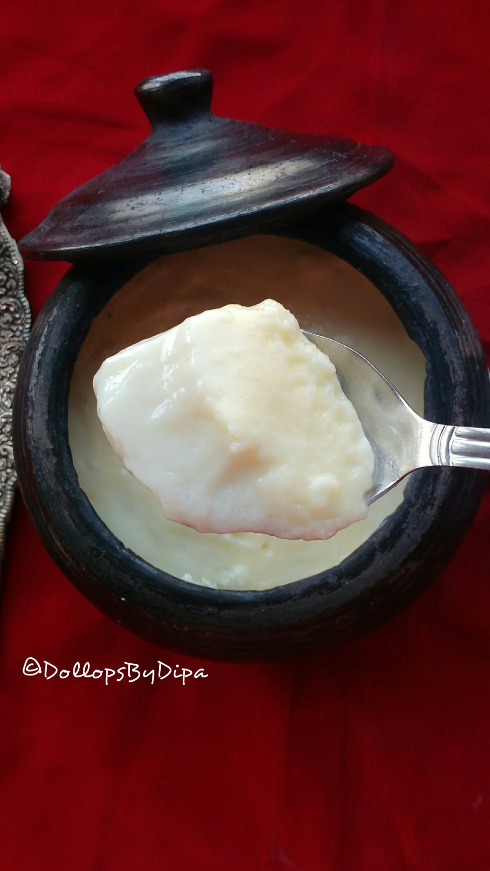 4. Transfer it in the earthen pots or your choice of vessel & allow it to set in warm place. It will take longer time than regular curd to set, around 10-12 hours.