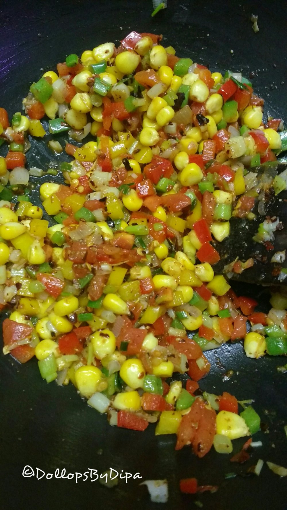 3. Finally add corn, all spices & seasoning, mix well & cook for 2 minutes. Turn off the heat.