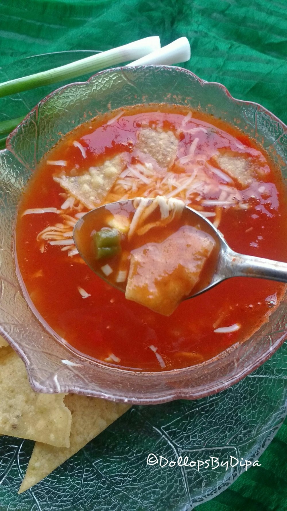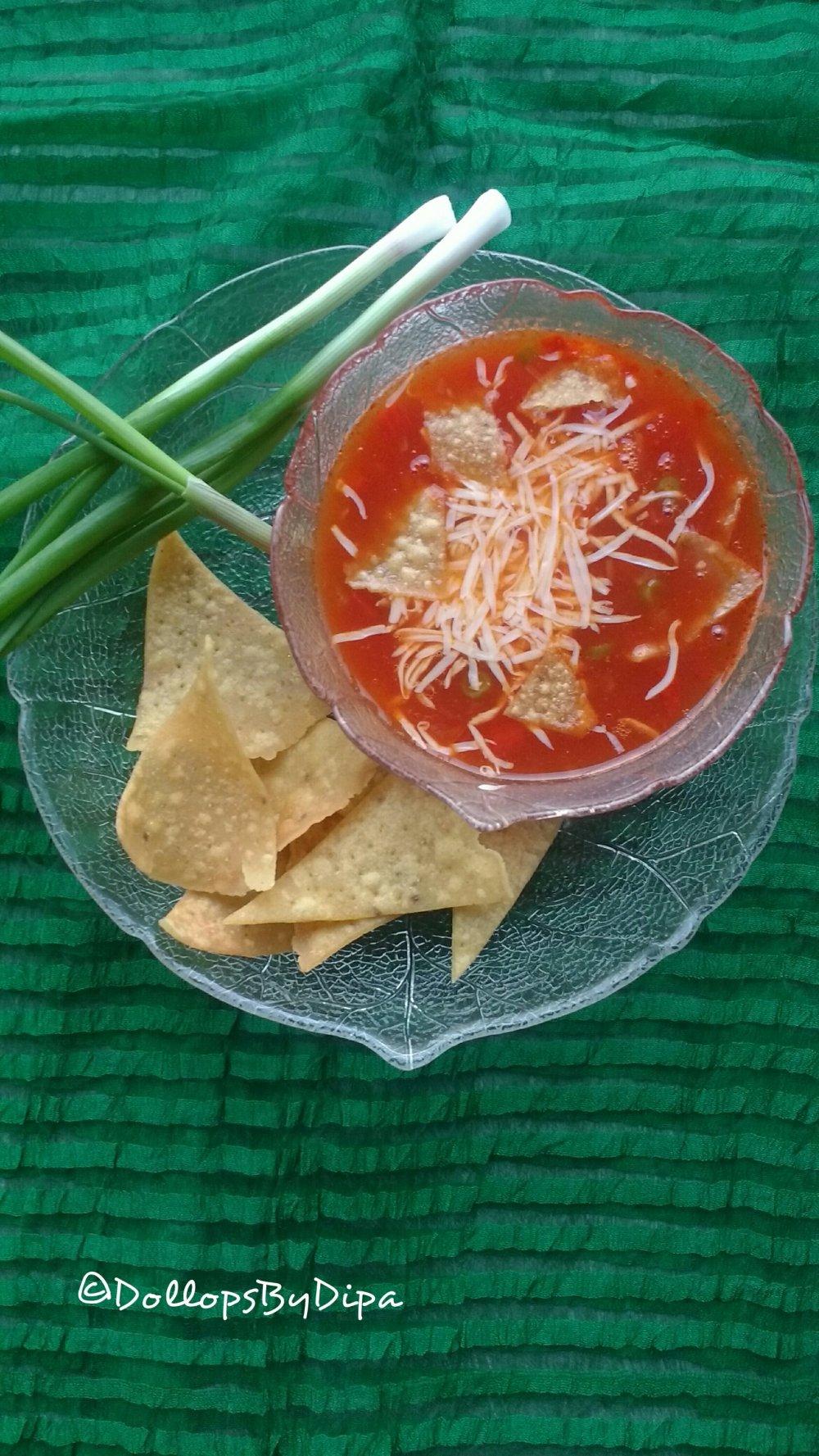 This soup is delicious combination of crunchiness & juicy flavours . This tomato base soup contains vegetables as well as corn kernels. Crispy tortilla & cheese make this soup more appealing. So crunchy vegetables & crispy nacho chips make wholesome & bowlful treat.