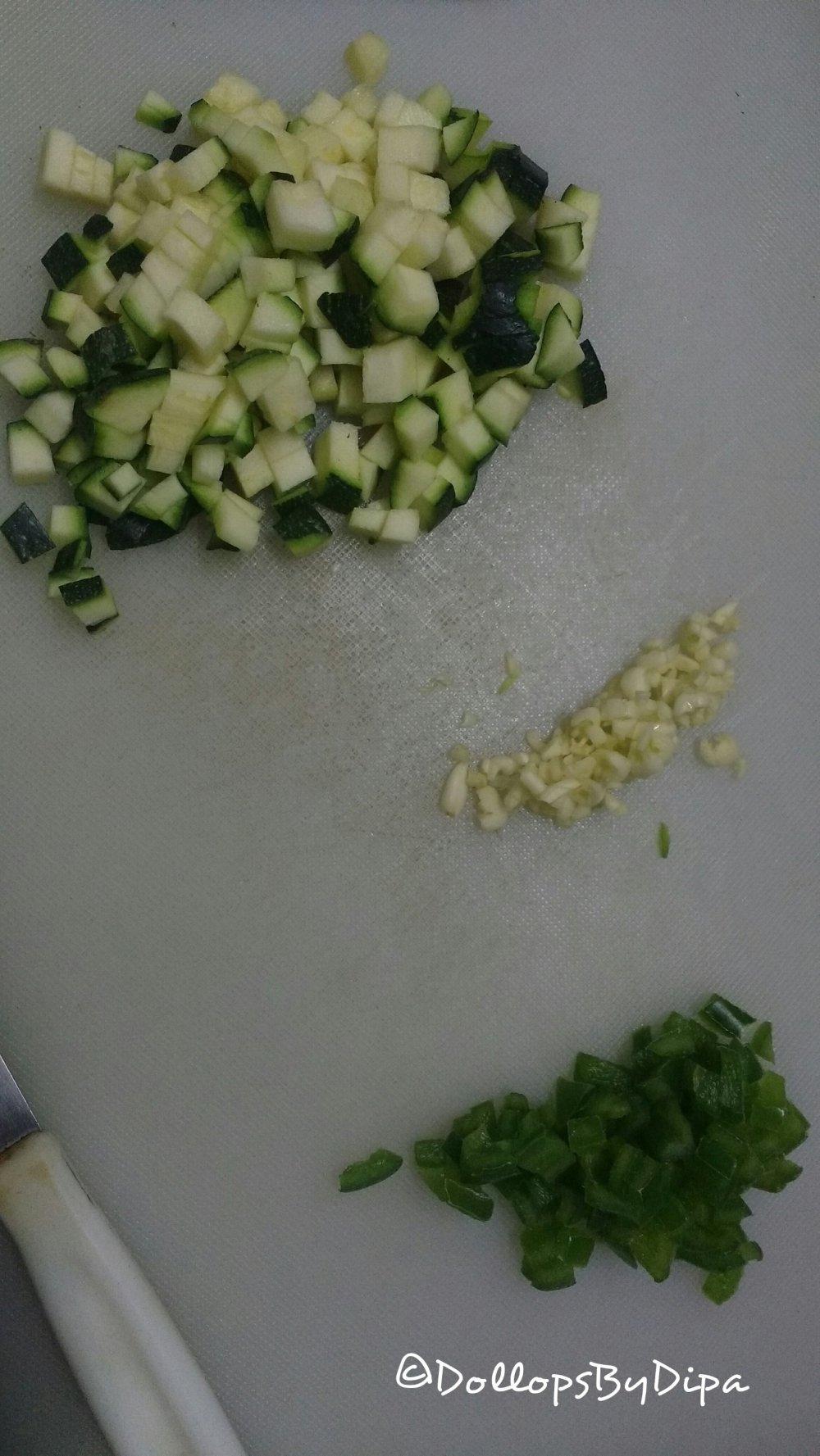 1. Heat oil & saute garlic for few seconds then add zucchini & capsicum. Saute for 2-3 minutes.