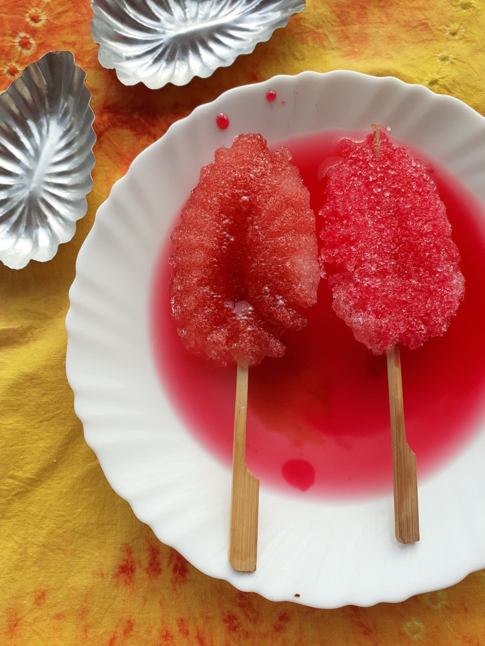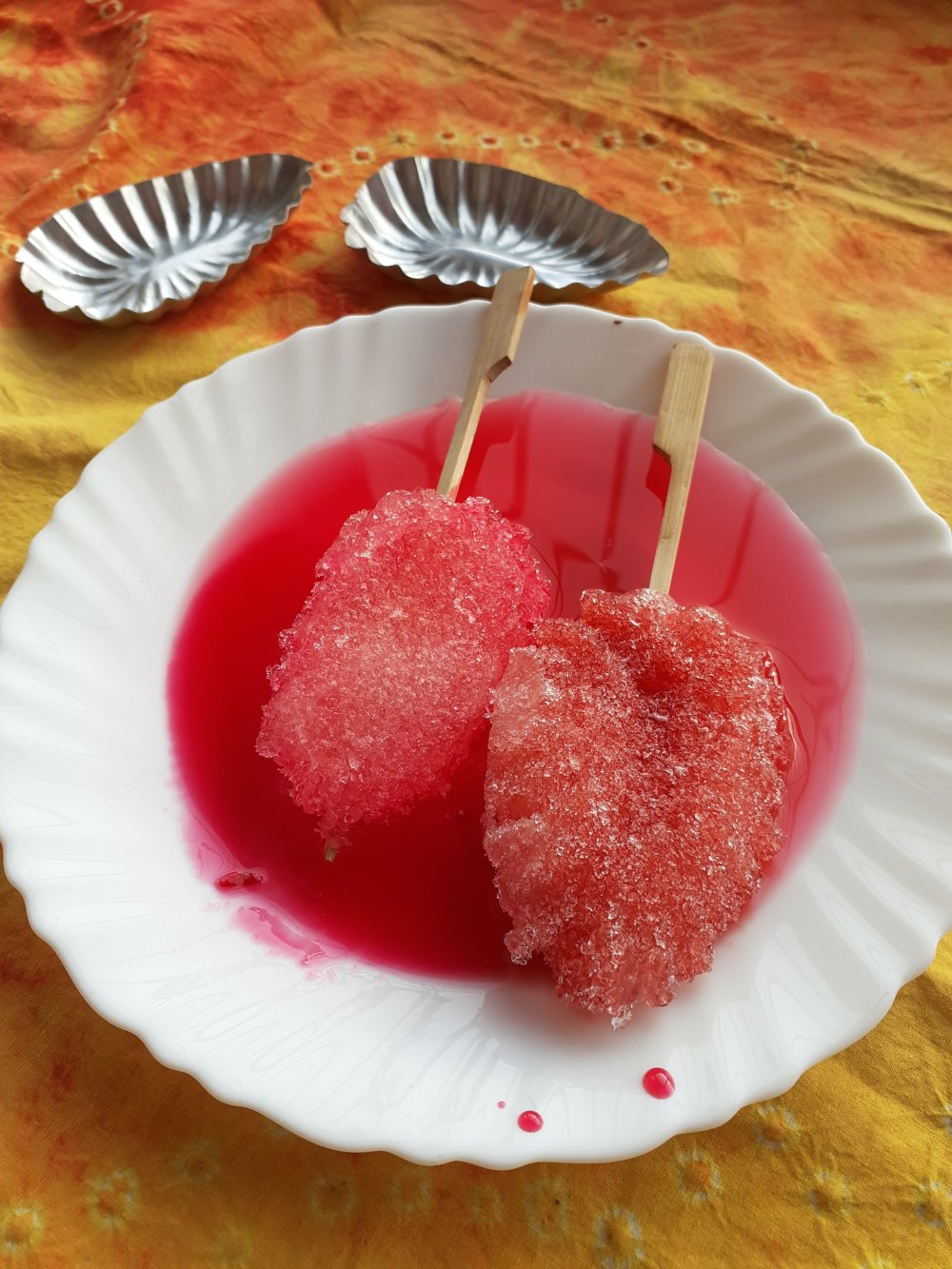 This juicy chilled gola is my childhood love. As soon as summer starts roadside venders are seen selling ice golas. Now days there are many other deserts are available along with gola & ice cream. As a kid & as a grown up , I love gola & then ice cream. Few years ago when mineral water ice gola were not available & as regular ice is not so hygienic, my hubby did not allow me often to have gola. So he brought Gola machine for home use. Now a days there are electric machines also available. Gola is just like slush but it is served on wooden stick ( popsicle).