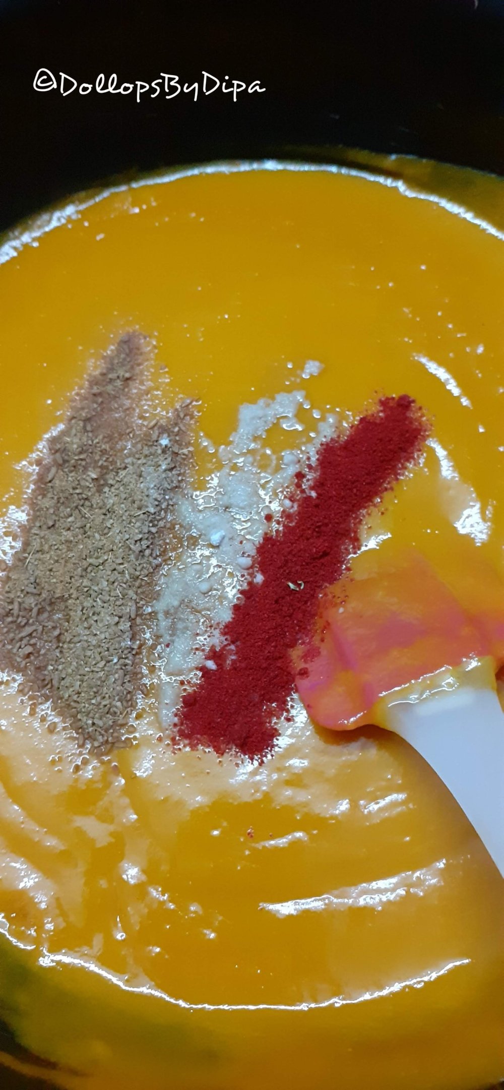 3. Once it becomes little thick, turn off the heat & add all spices & mix well. If mango is not sweet , add sugar while making pulp.