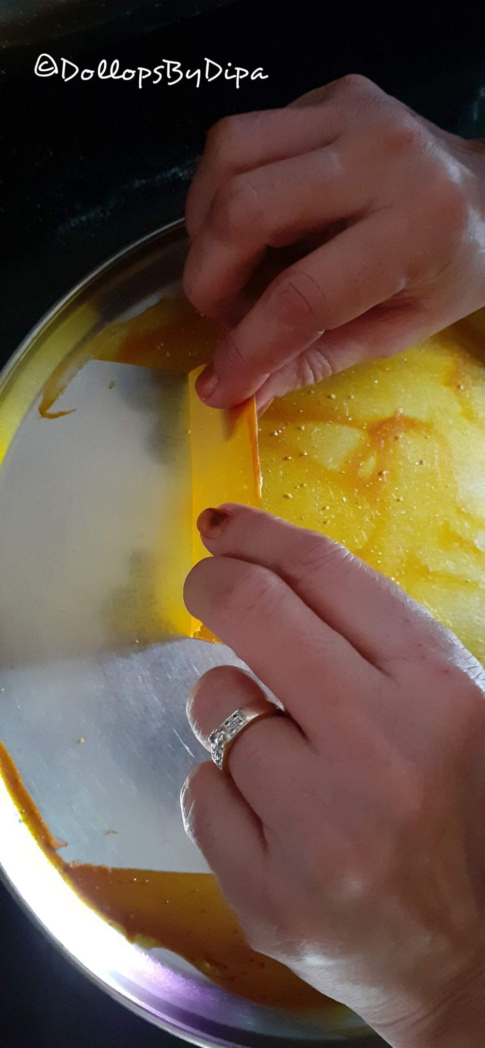 4. Now in a greased plate spread this pulp in thin layer & let it dry in strong sunlight . If sunlight is strong & layer is thin , will dry in a day or two.