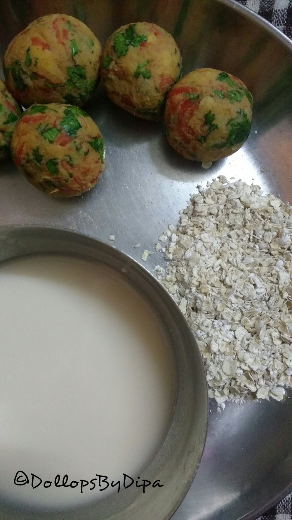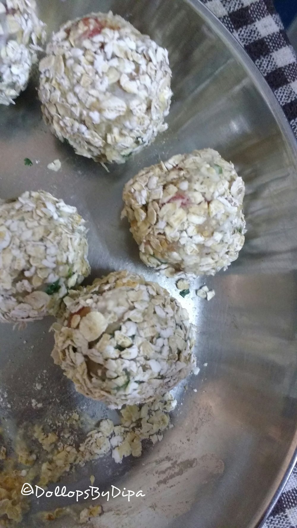 4. Make slurry of cornflour by adding little water. Dip the ball in it, roll into oats.