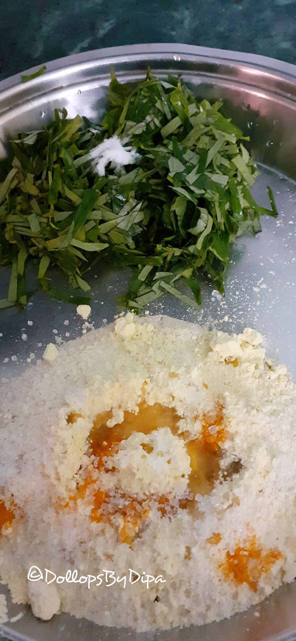 2. Now mix flour mix & leaves mix & form a soft dough like mass ,add little water as needed.