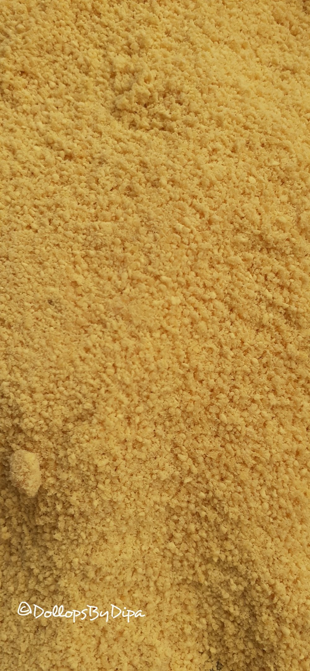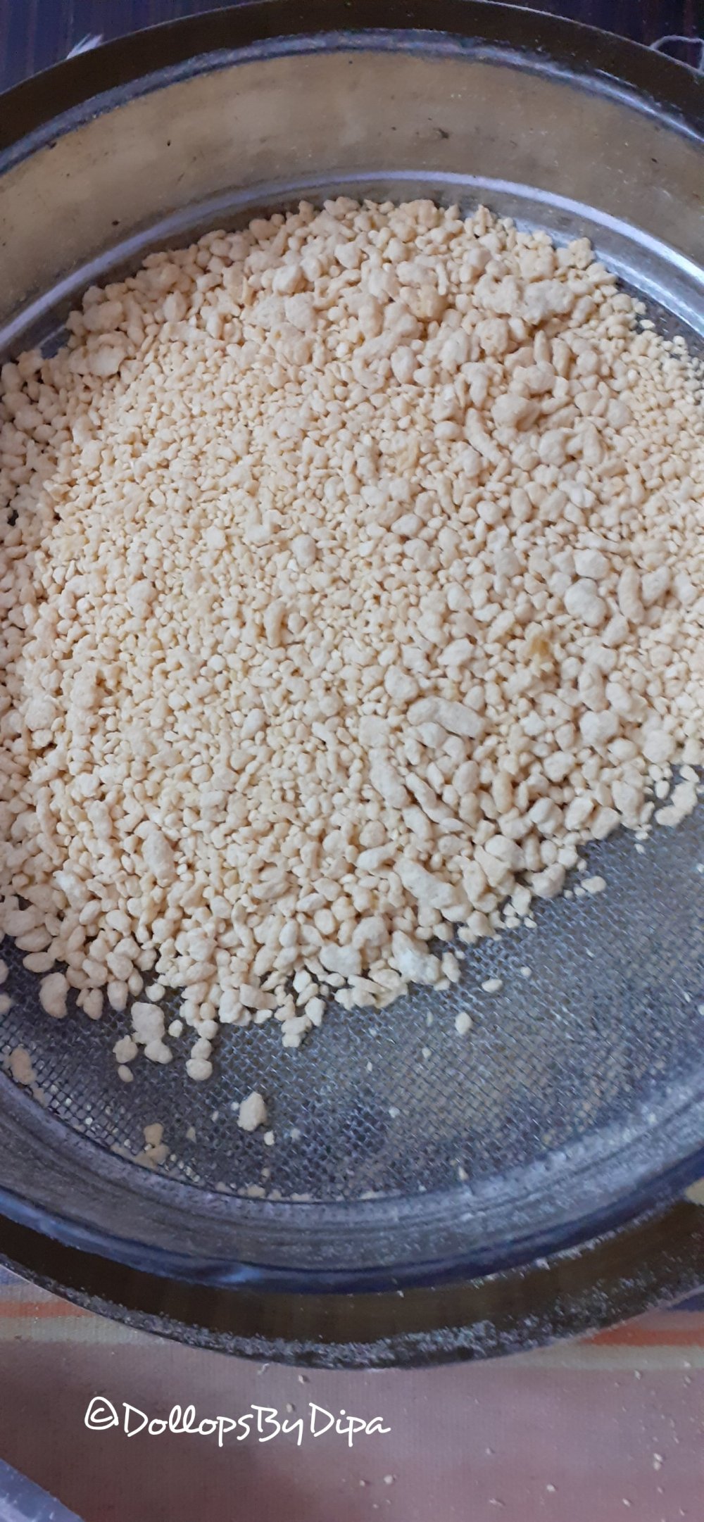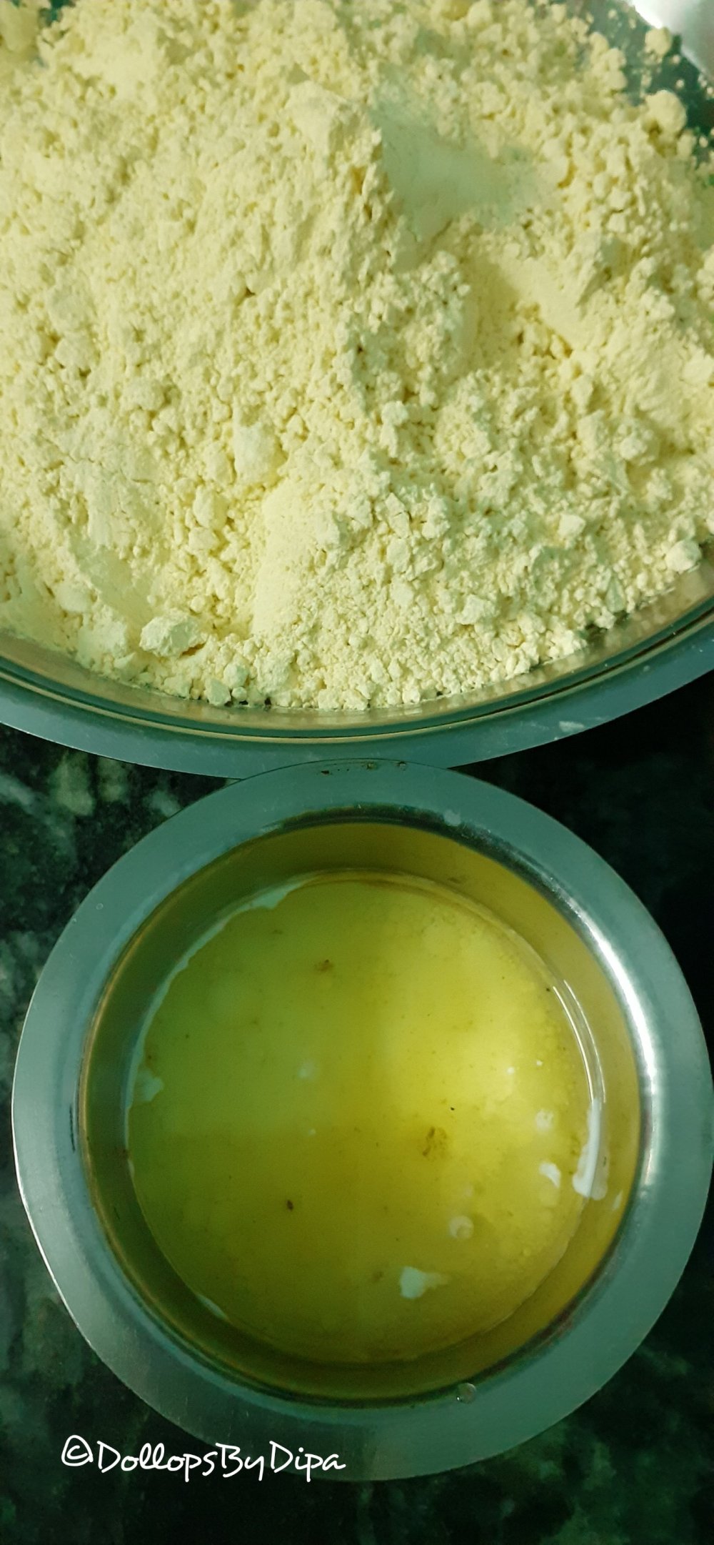 1. Add 2 tbsp ghee in warm milk. Mix well. Now slowly add this mixture in gram flour & mix in crumbly texture. Do not add more milk ghee mixture to the gram flour.
