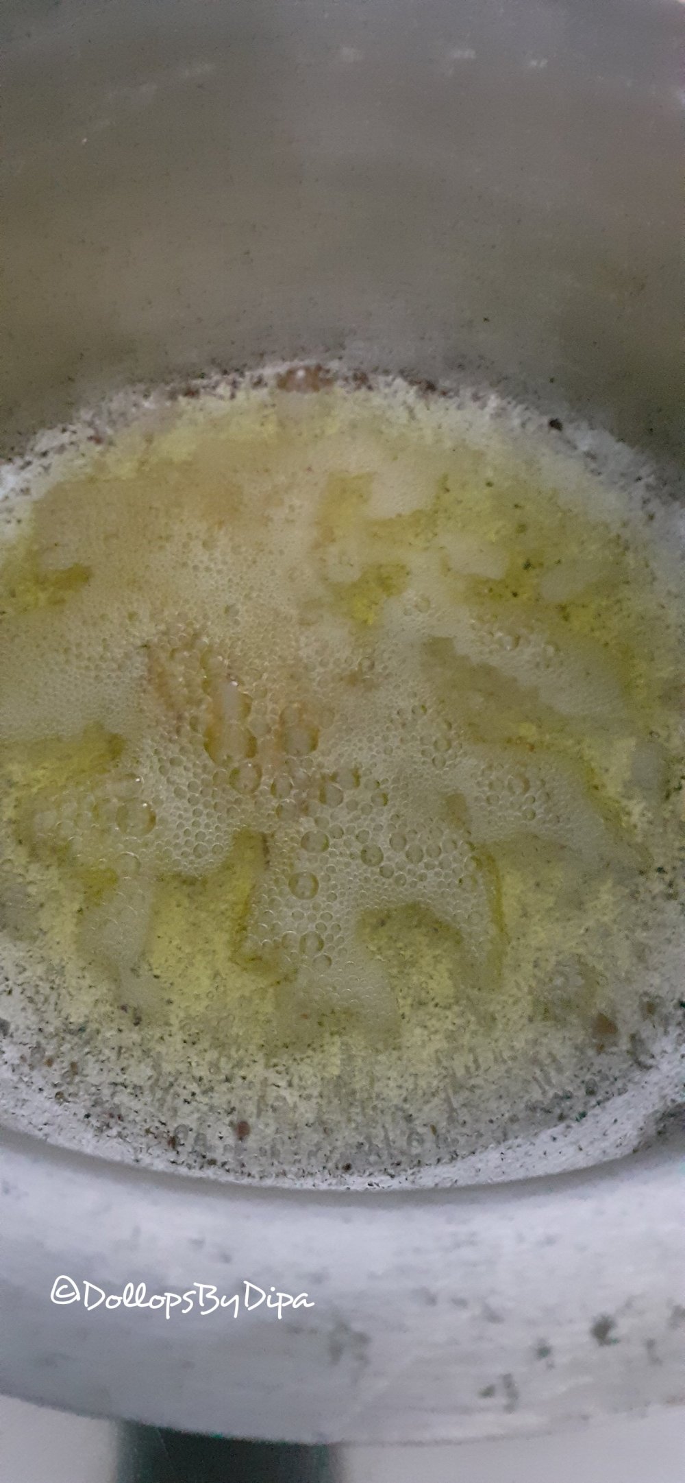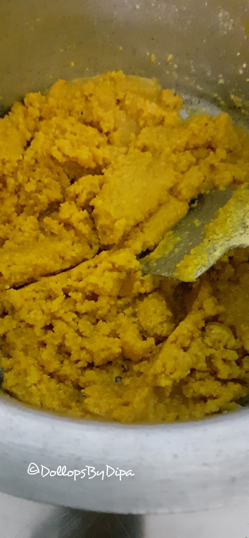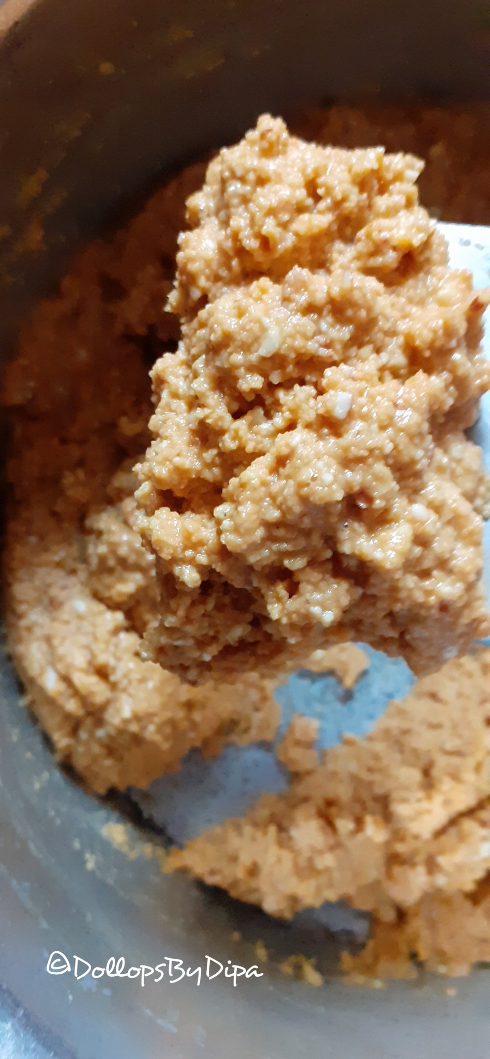 1. Add 2 tbsp ghee in warm milk. Mix well. Now slowly add this mixture in gram flour & mix in crumbly texture. Do not add more milk ghee mixture to the gram flour.
