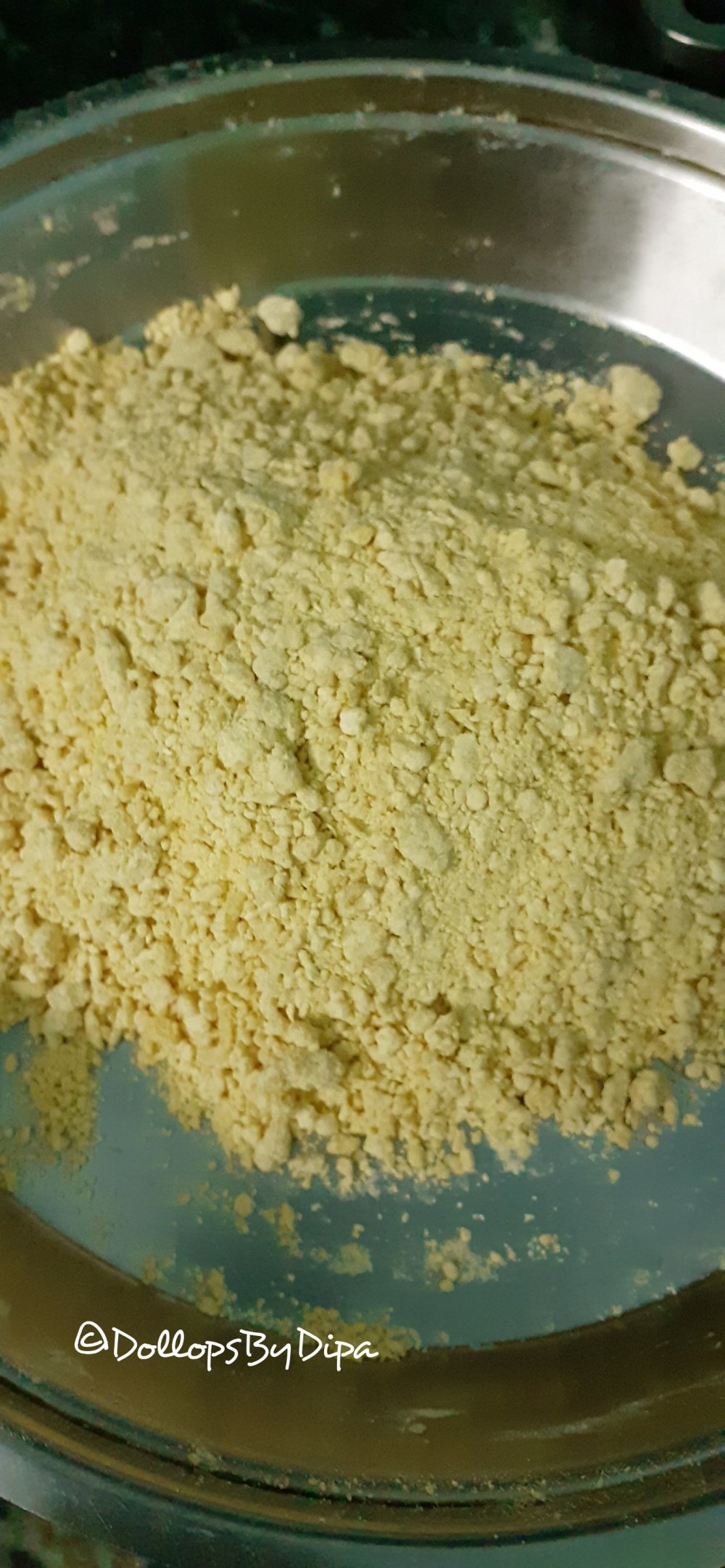 3. Heat ghee in thick bottom vessel. Saute sieved gram flour on slow flame till it becomes lighter & you smell aroma.
