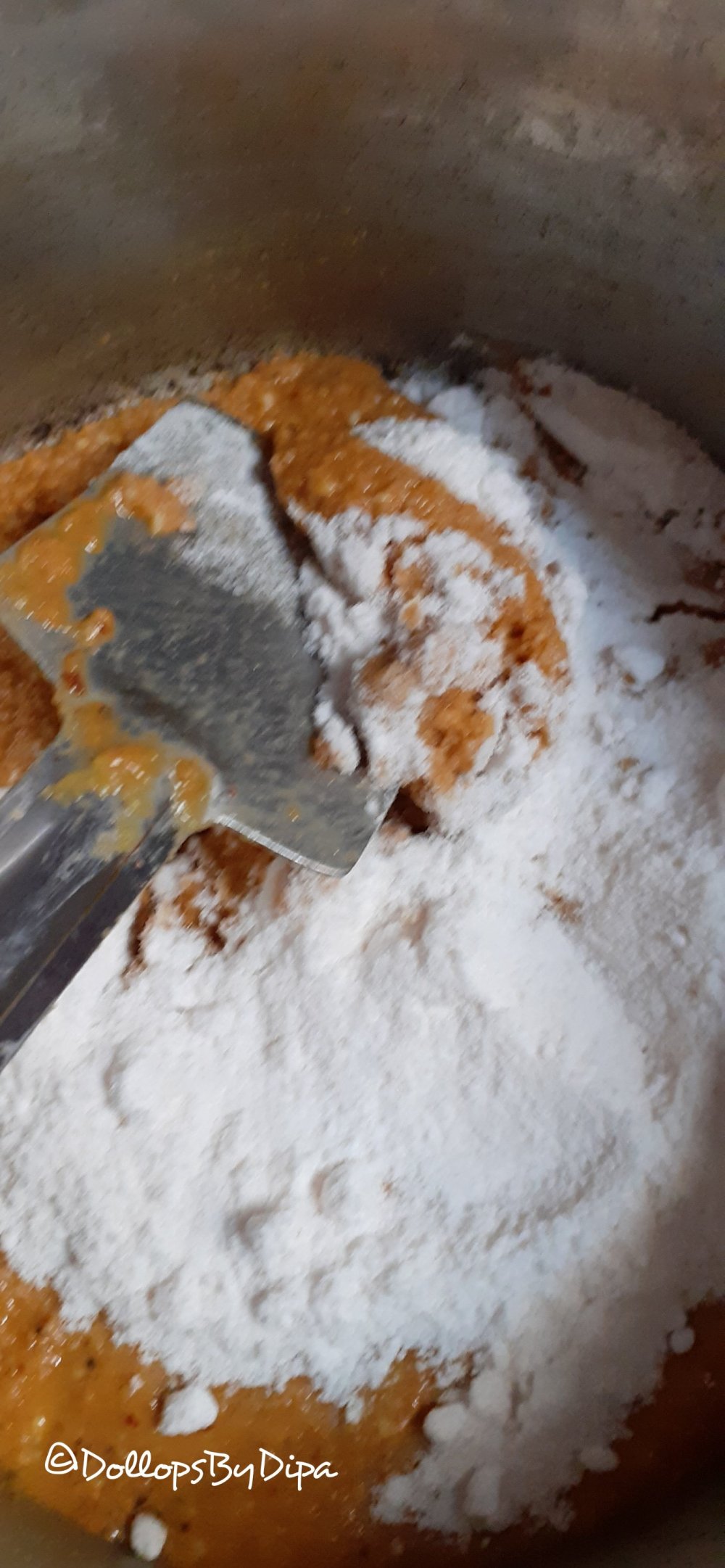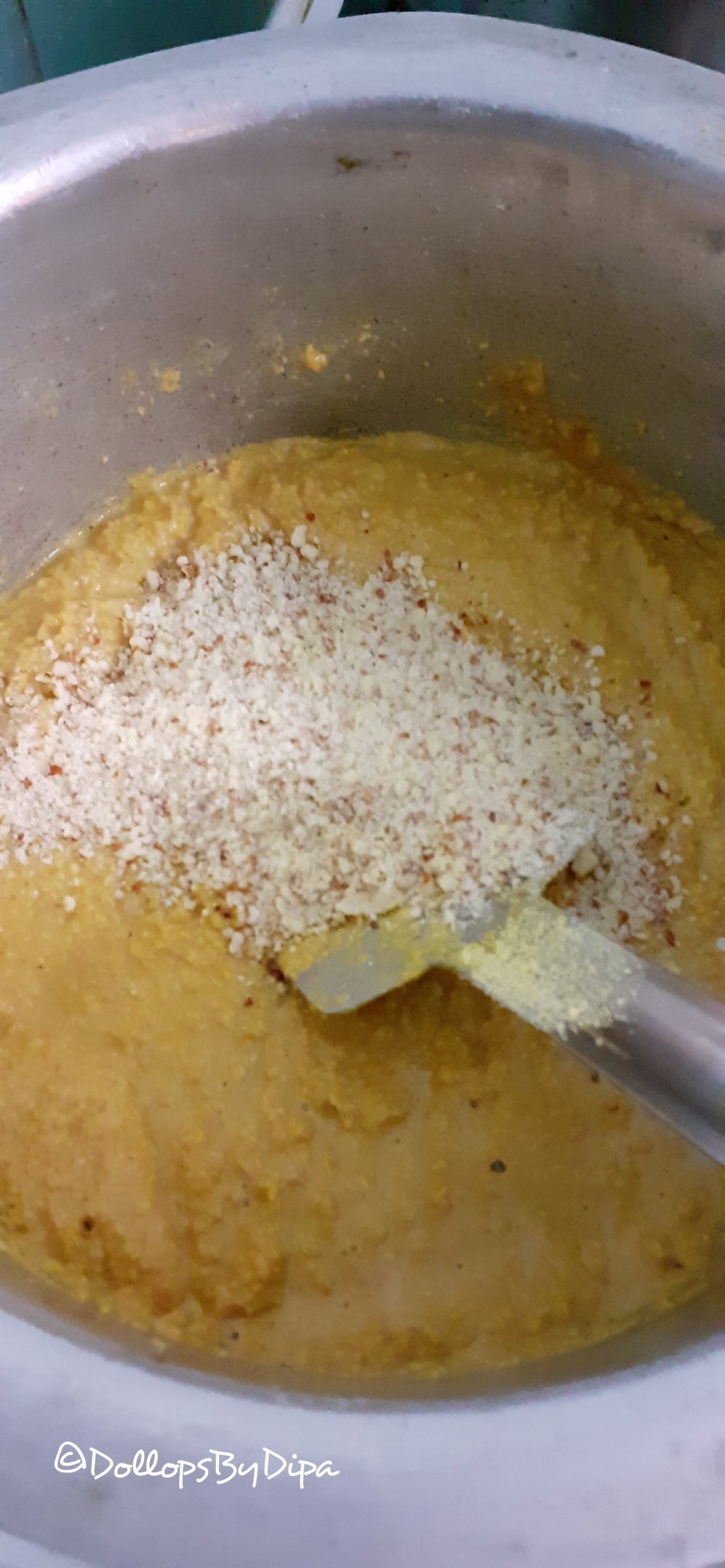 4. When it is about to saute, add almond powder, mix well & saute for while . Then add cardamom powder , mix well & turn off heat.