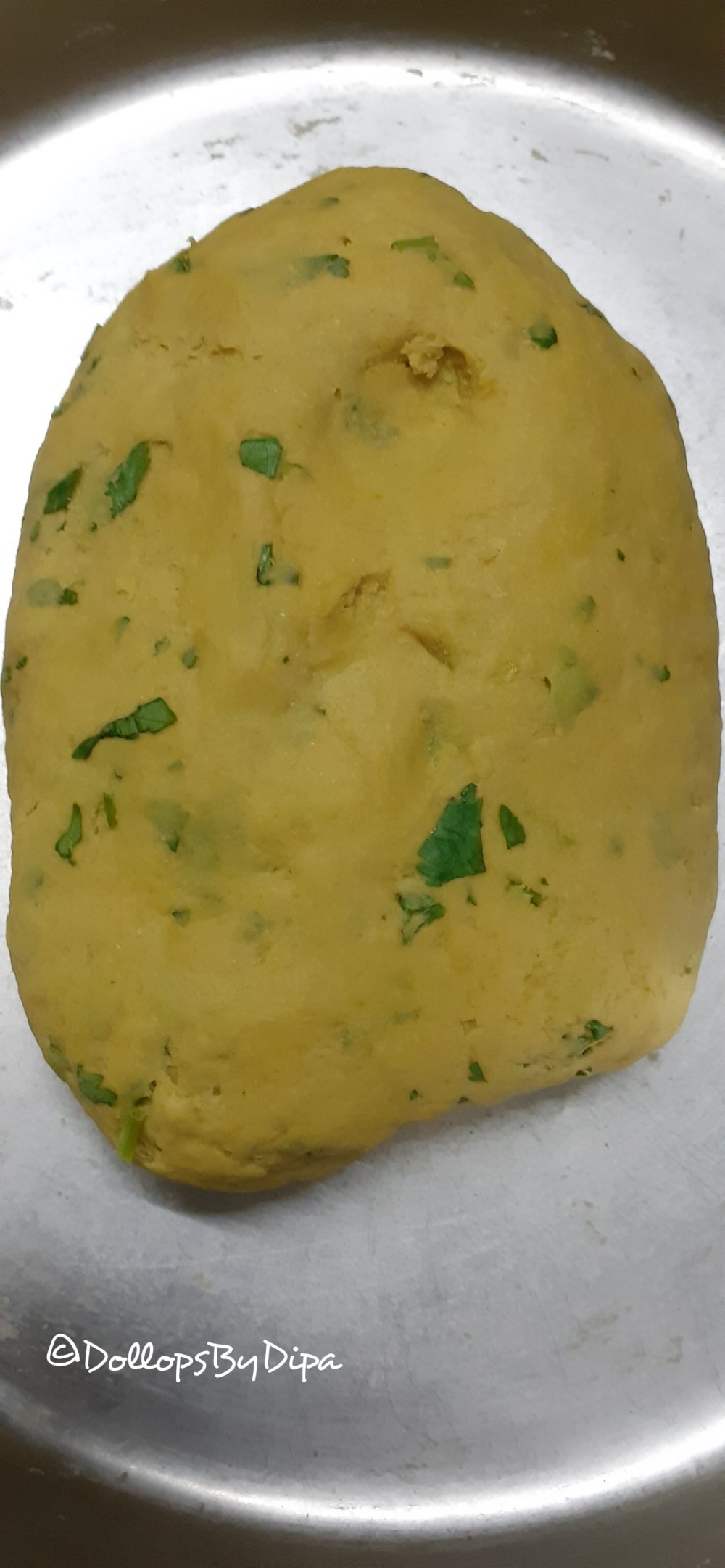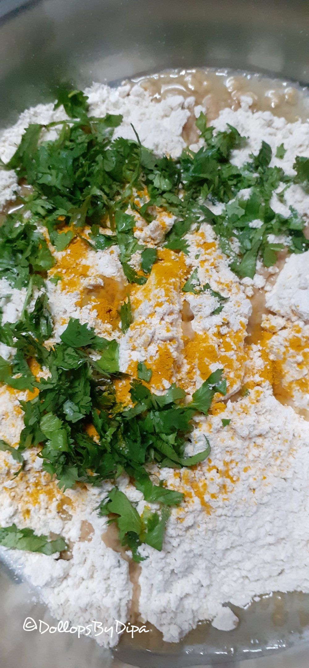 1. Add oil, turmeric powder & coriander into the wheat flour & knead soft dough.