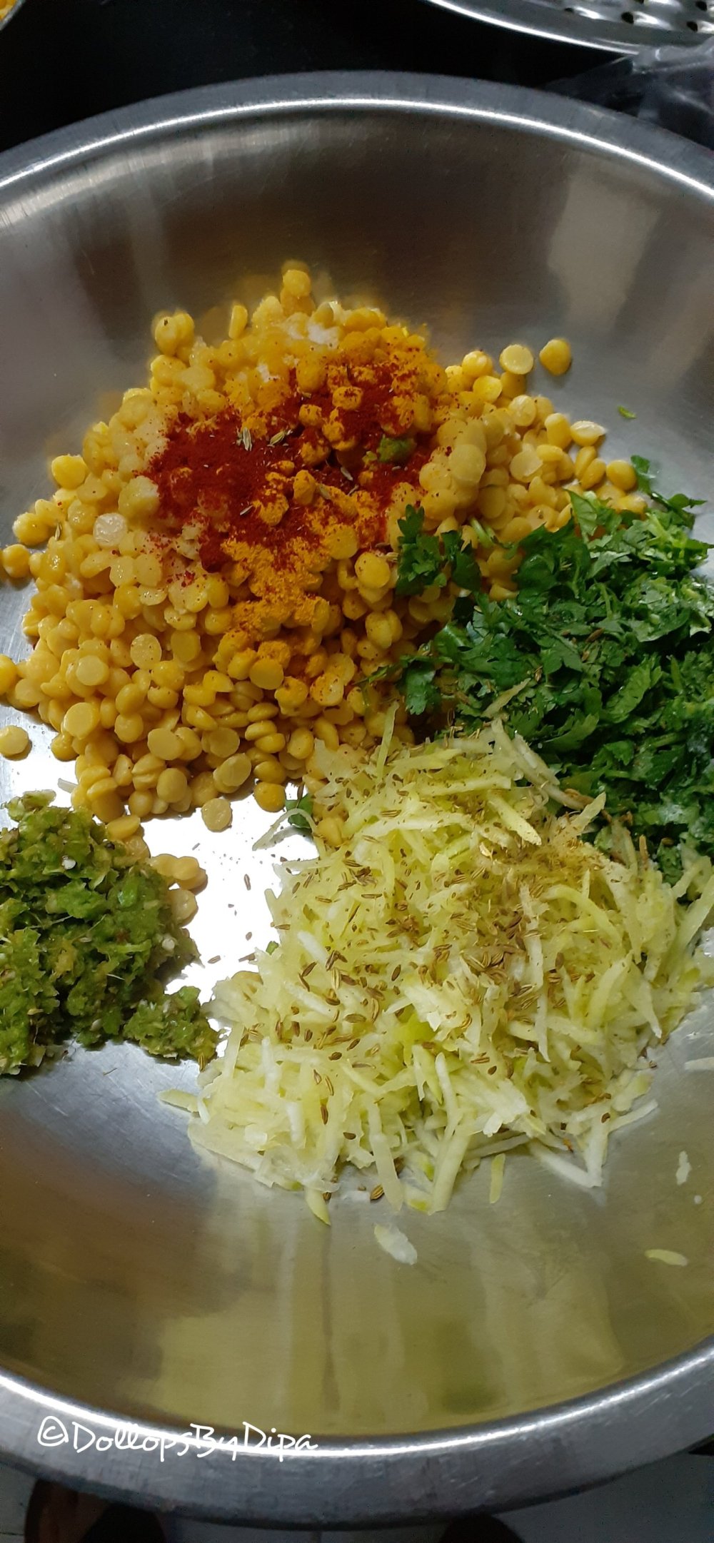 2. Now for the stuffing, take one bowl & add boiled split gram ( drained ) ,garlic ginger paste, green chillies, coriander ,fennel seeds, red chilli powder, turmeric powder, grated raw mango & salt . Mix well.