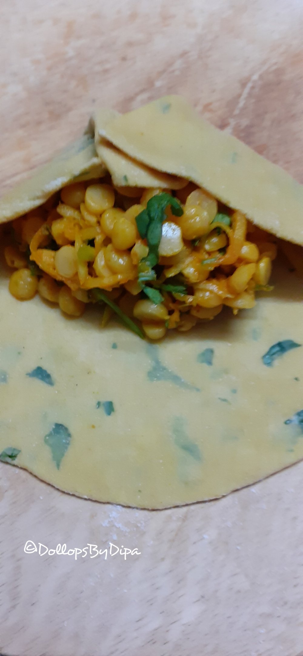 3. Now divide dough in equal poetions , take one portion & roll little , put spoonful of stuffing & cover from all sides & seal it like we make a stuff paratha. Then roll it again.