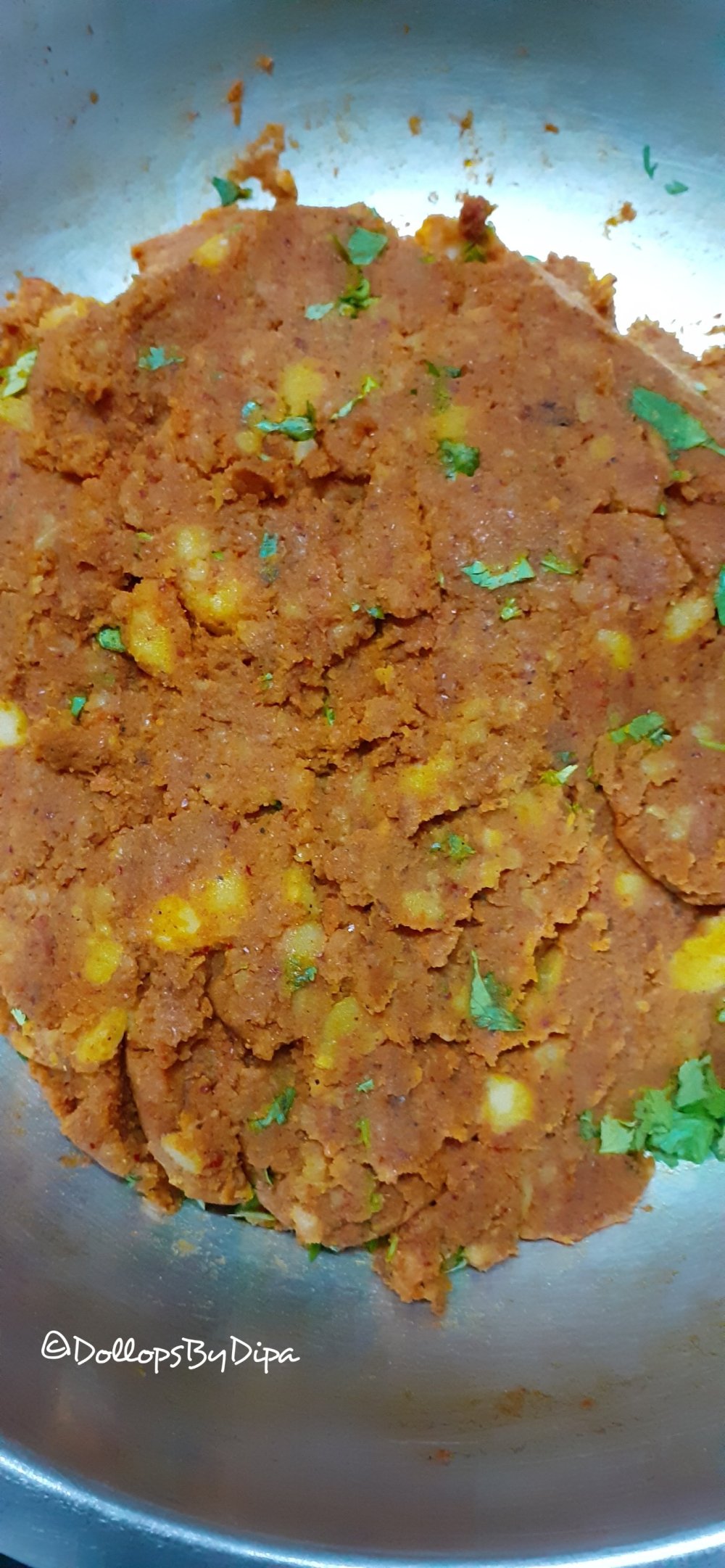 1. Heat oil, add mashed potatoes & dabeli masala, mix well. Add little water so it can mix properly.