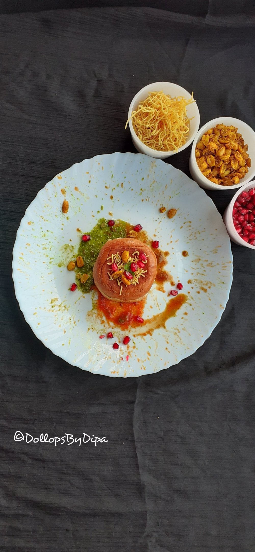 3. Now cut the bun from centre. Apply garlic chutney on one side & tamarind dates chutney on the other side. Put prepared stuffing ,add some onion, peanuts & pomegranate seeds.