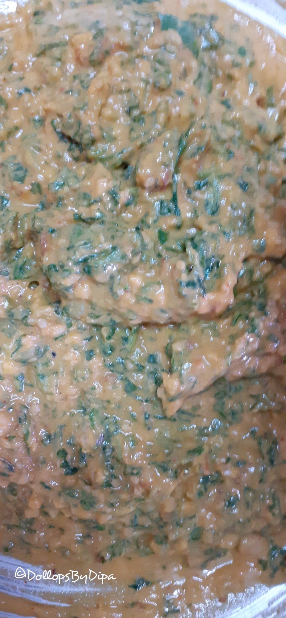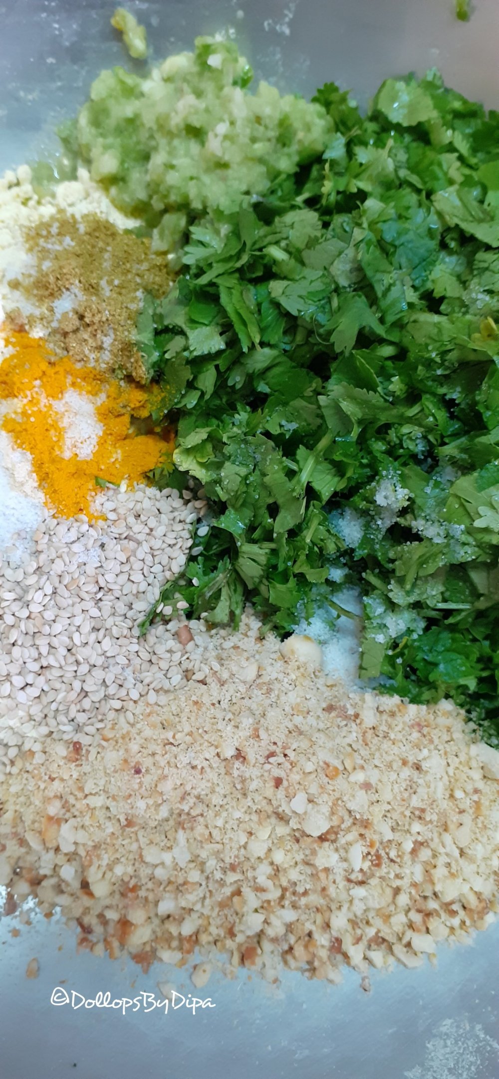 2. Take a bowl, add all dry ingredients, paste, grinded peanuts & coriander in gram flour. Mix well and prepare thick paste like batter by adding water.