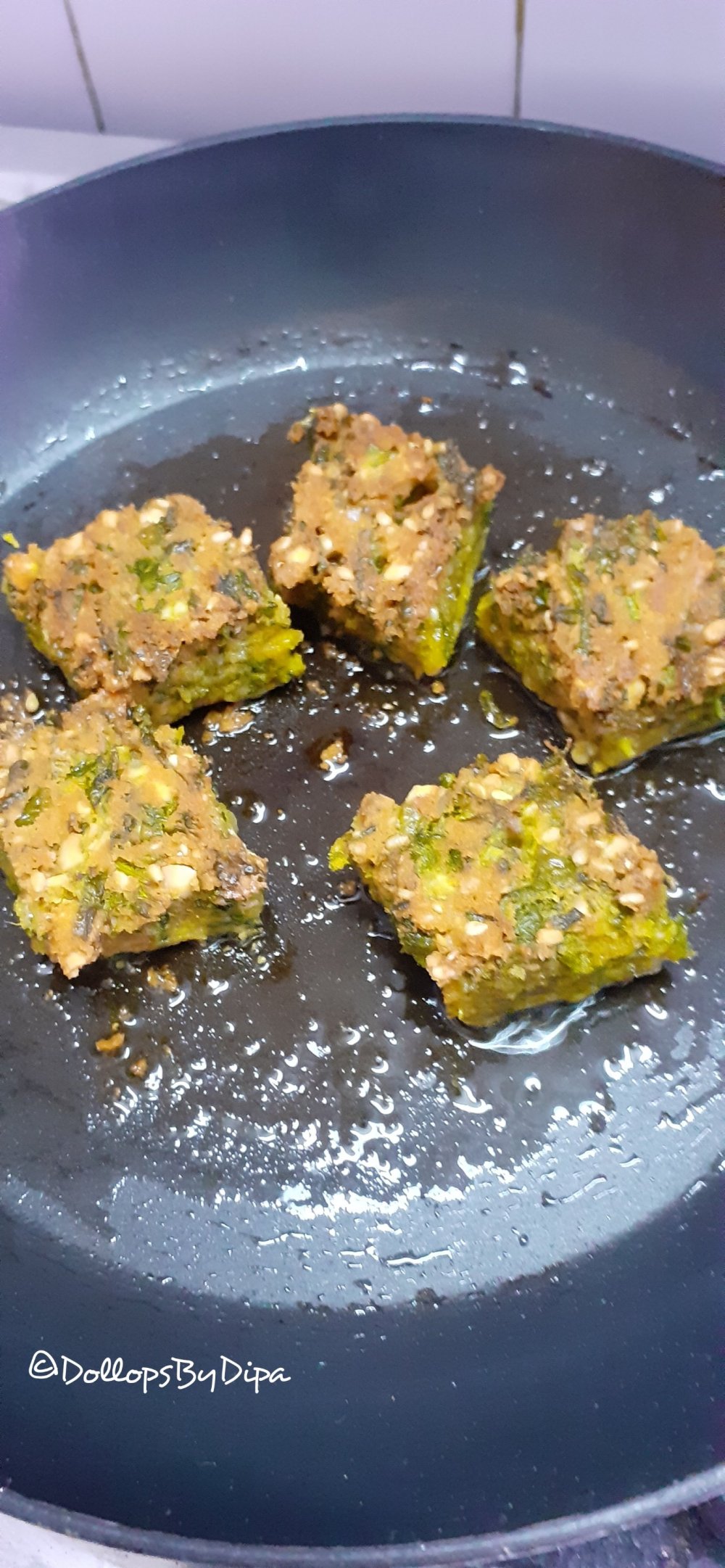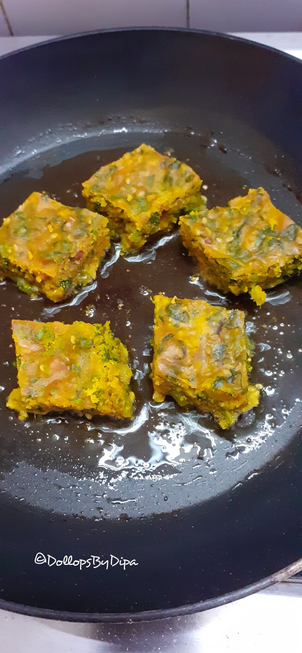 5. Now in a non stick pan or skillet, add little oil & heat, place few squares over it. Cook from both sides till they become crispy.