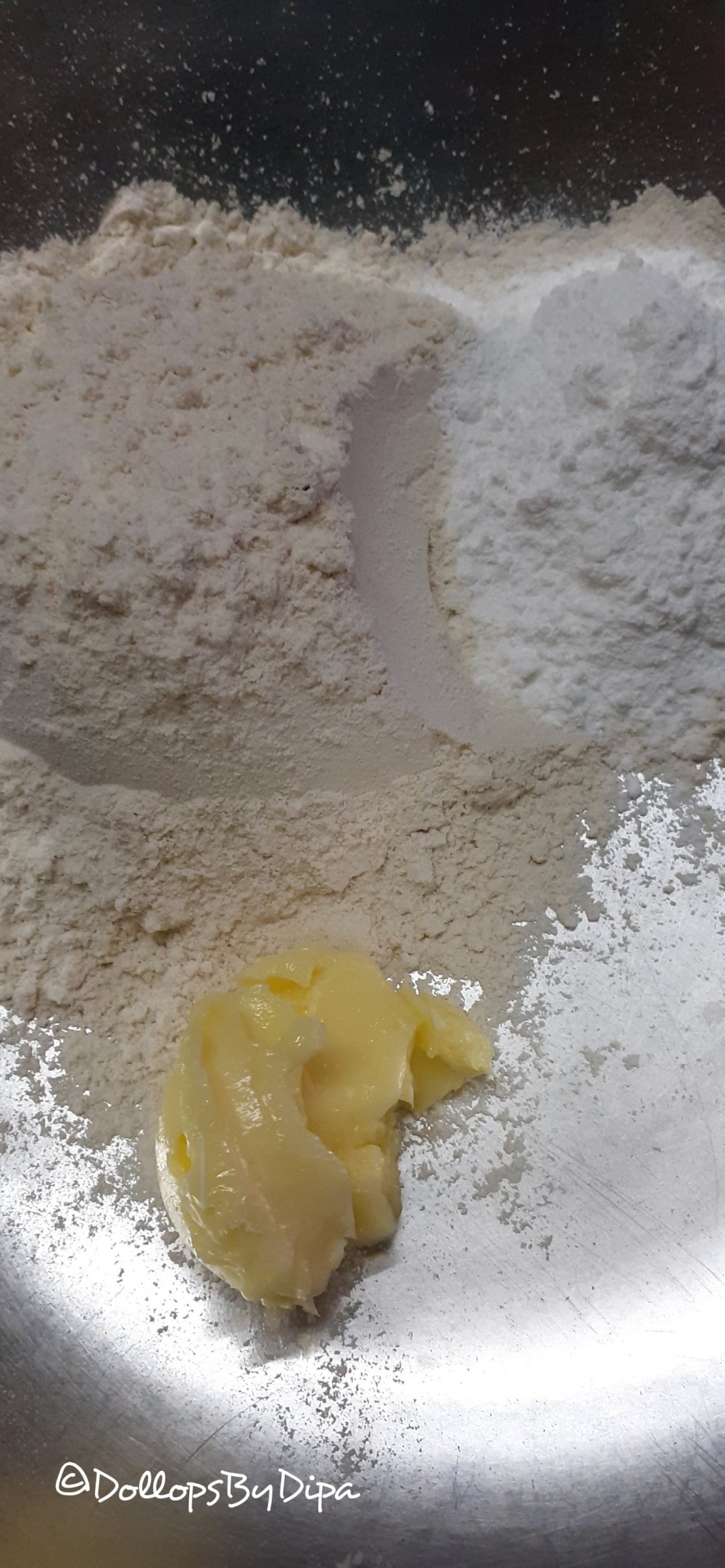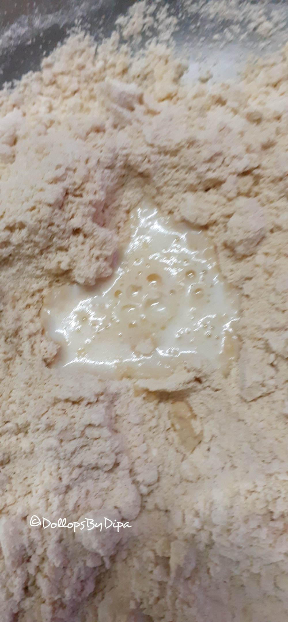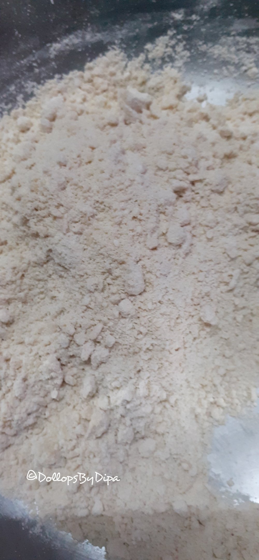 1. Mix flour , salt & sugar, then add butter in it & rub it with flour & crumble it. Now add milk little by little.