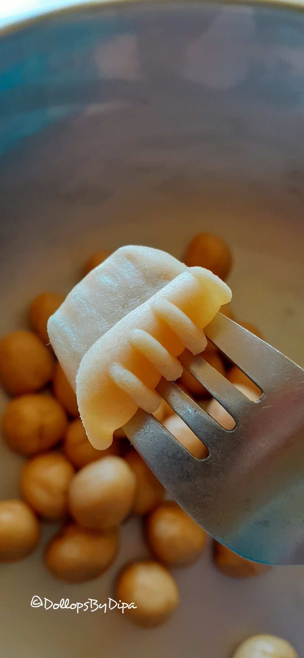 4. Now grease fork with butter, take one ball of dough& place it on the back side of fork & gently flatten thin , then roll it as shown in the picture.