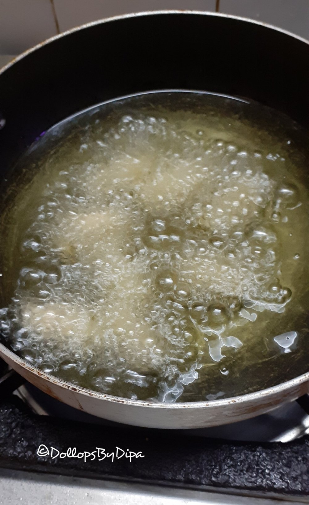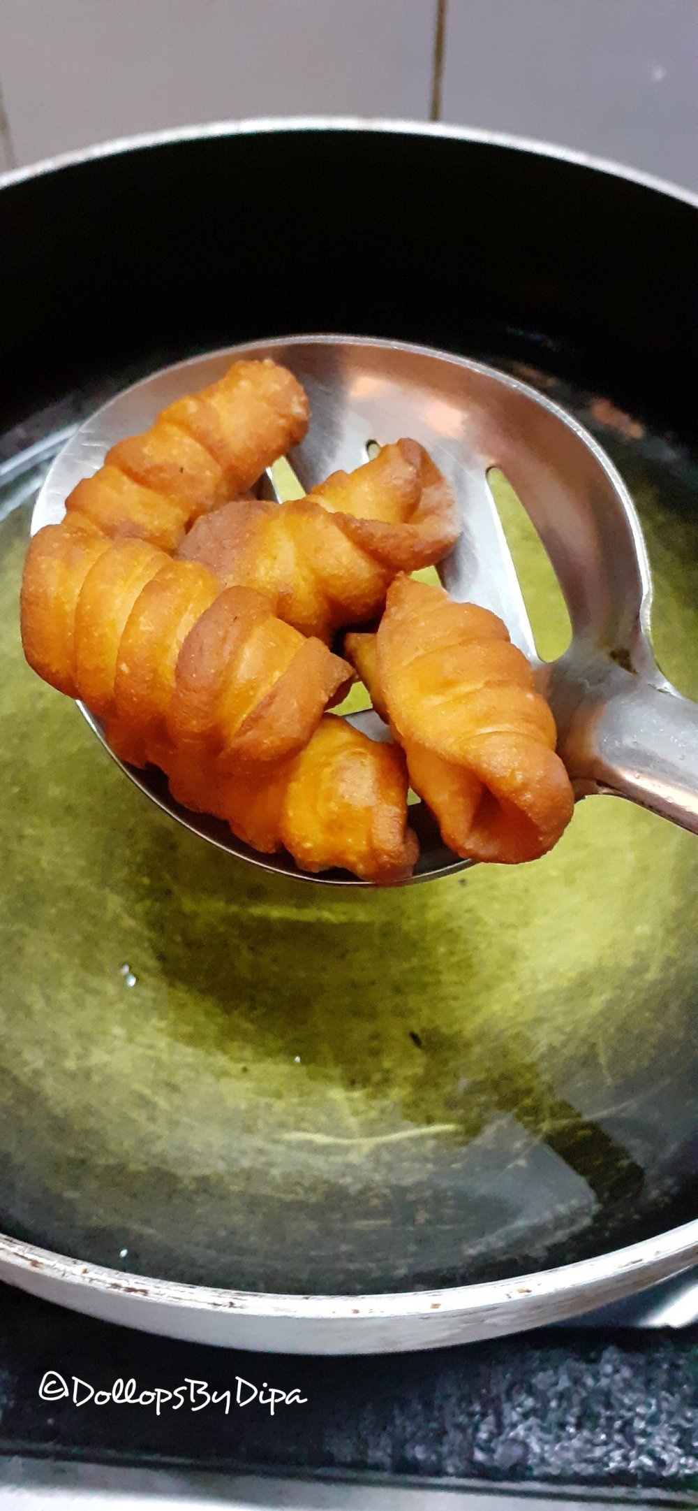 6. Then heat oil & fry the kulkuls on medium to slow flame till they become golden brown. Flip it in between while frying.