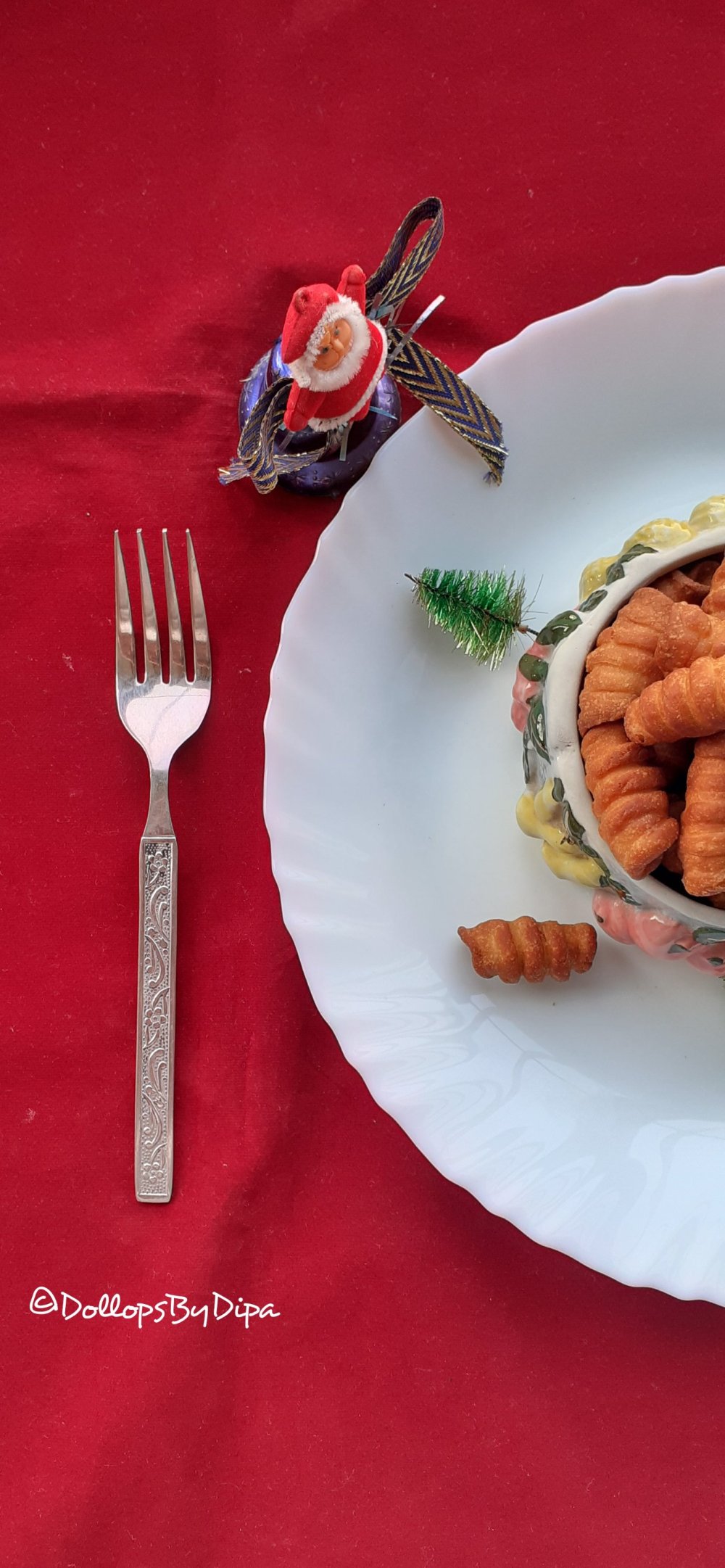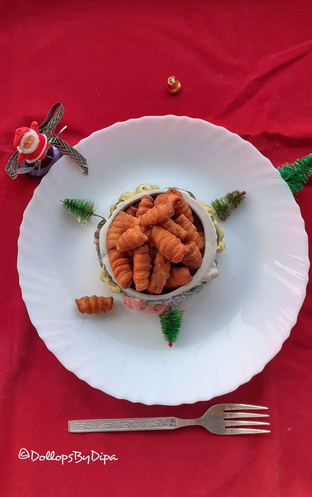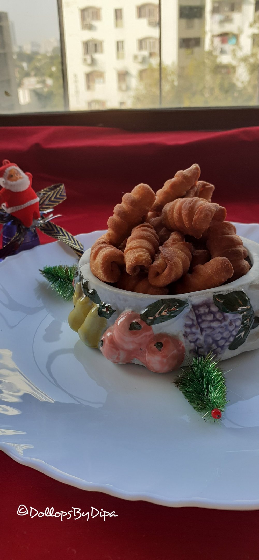 When searching for vegetarian Goan delicacies, got many dishes which are unknown to me. At last my choice goes on to Kulkul – a traditional Christmas sweet made of all purpose flour. Kulkuls which pronounced as ‘Kalkal’ & also known as ‘Kidyo’ are an integral part of ‘ Kuswar ‘ ( tray filled with traditional Christmas goodies ) which are served when friends and family visit during Christmas. There are slight variations in the recipes of kulkuls depending on whether you like it crunchy, crunchy and soft, with or without glaze, frosted or lightly dusted with sugar powder.