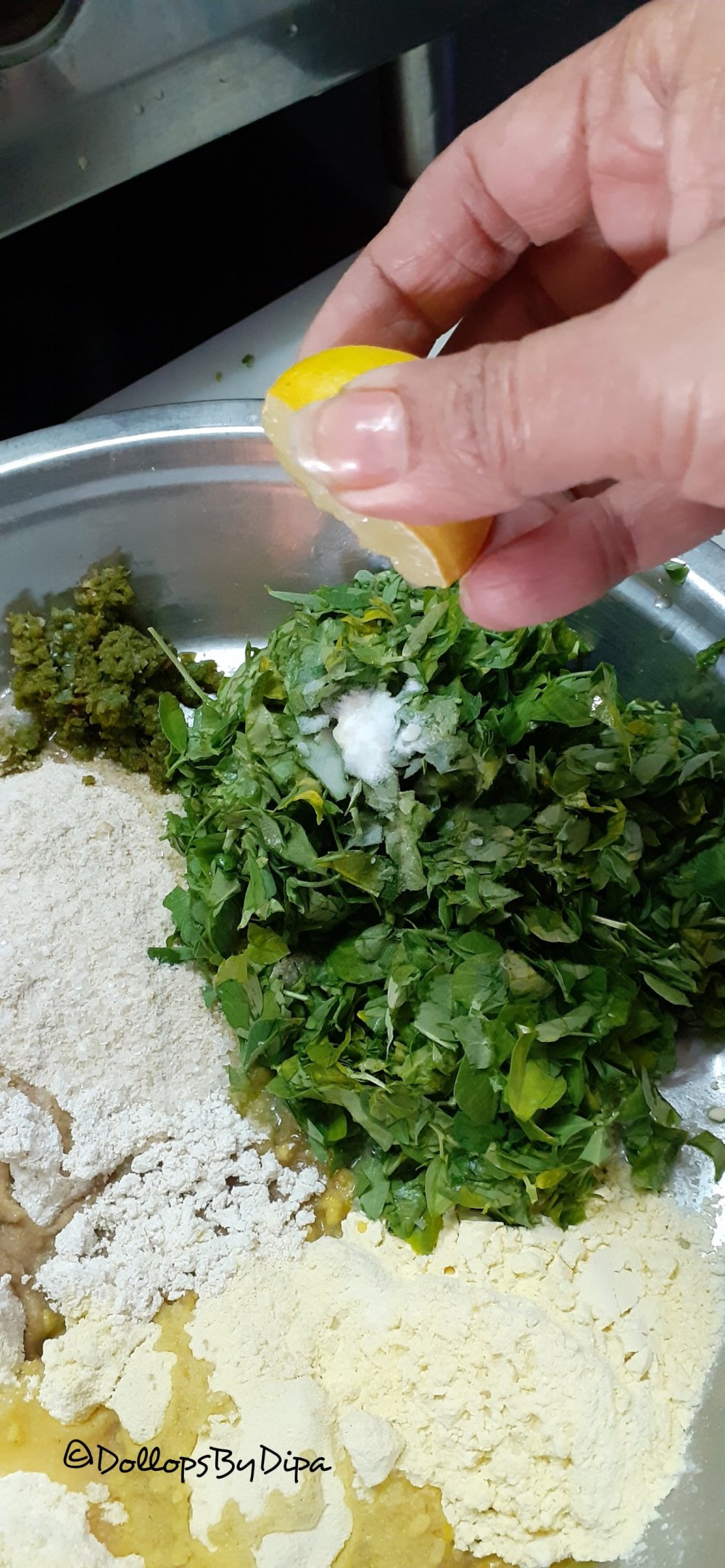 1. Mix all flours,oil ,salt ,sugar and turmeric powder and crumble it. Spread baking soda on fenugreek leaves and pour juice of lemon over it. It starts bubbling , mix it well with leaves. Now add leaves, chilli paste in flour , mix well and knead soft dough. Add water little by little.