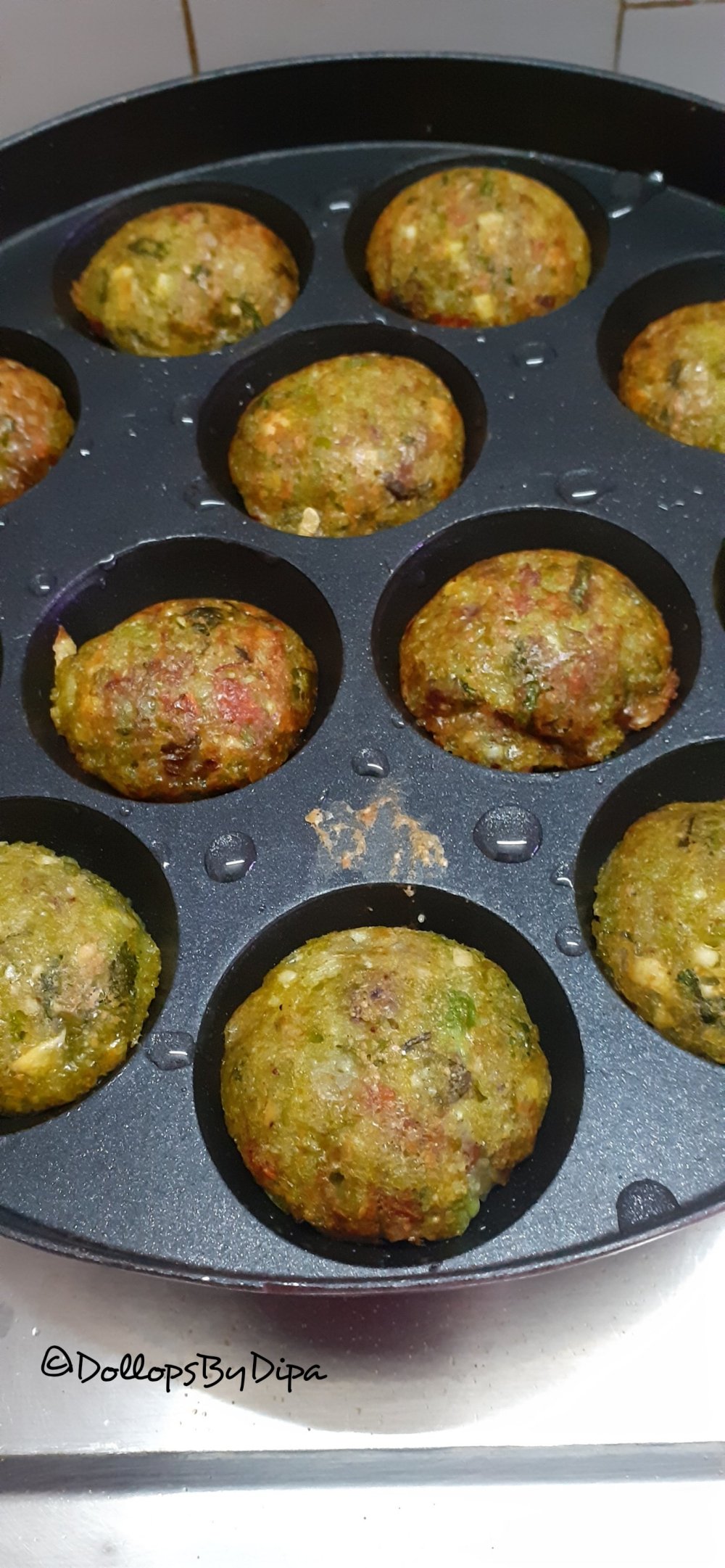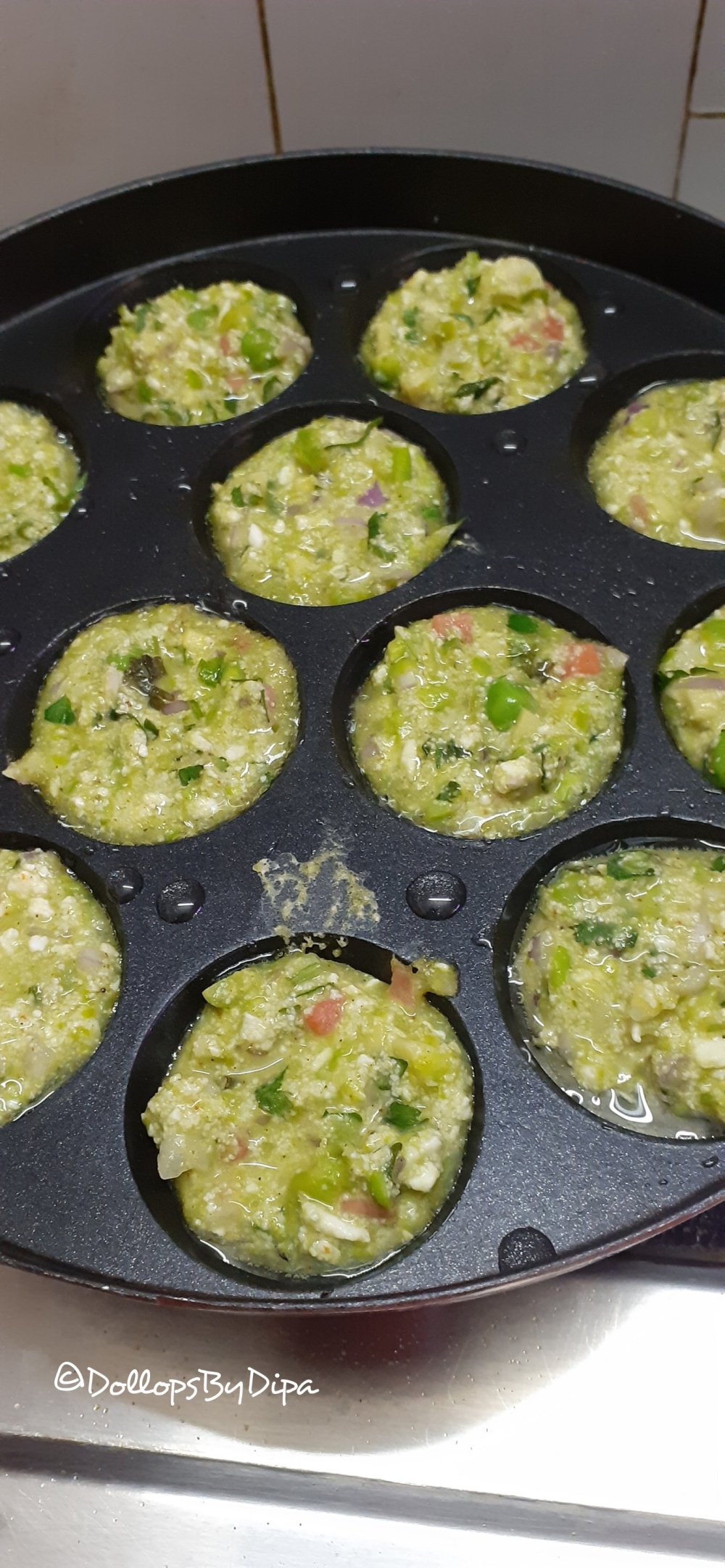 4. Grease and heat paniyaram pan, fill it’s cavities with prepared batter, cover and let it cook for 3-5 minutes .