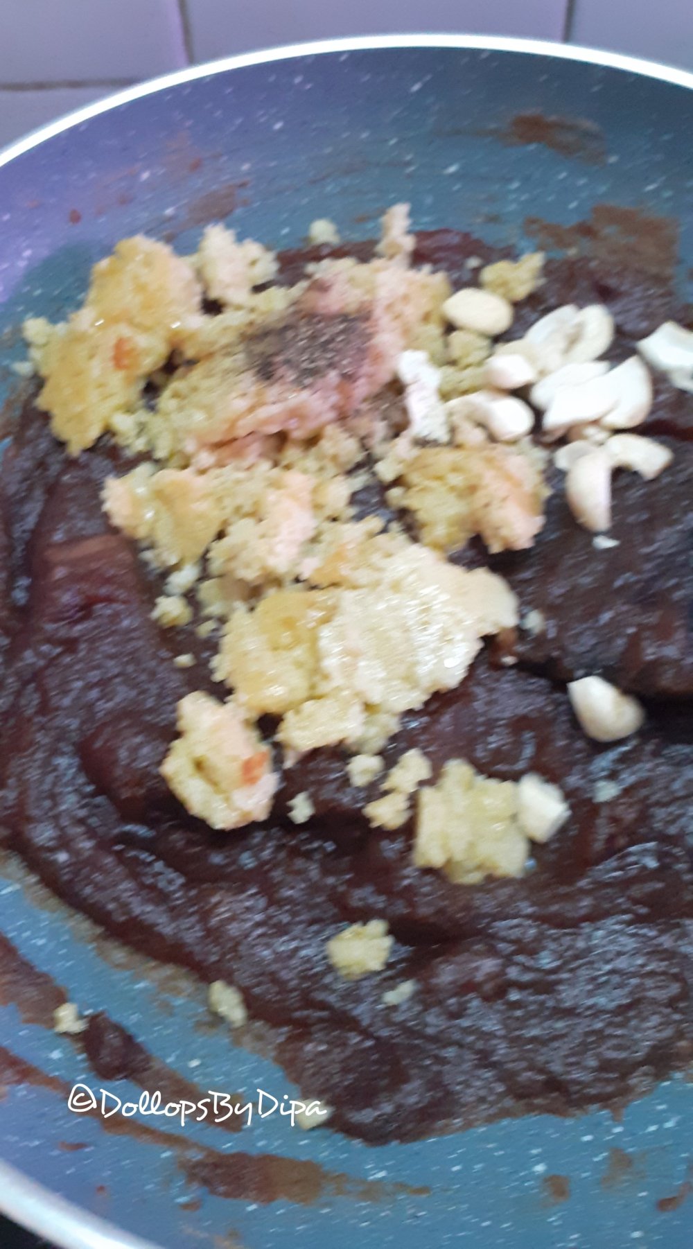 5. It’s time to add khoya, cashew nuts and cardamom powder, mix well and cook for 4-5 minutes on slow flame. It will start leaving sides of the pan and becomes a thick lump. Our halva is ready. Turn off the heat.