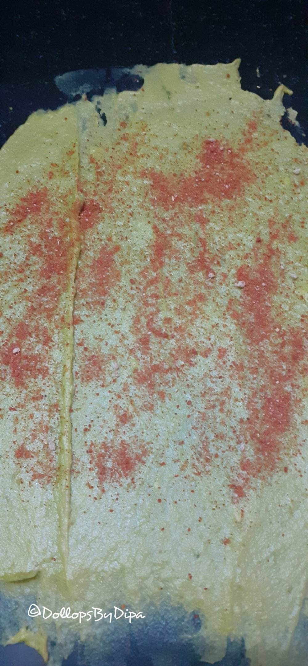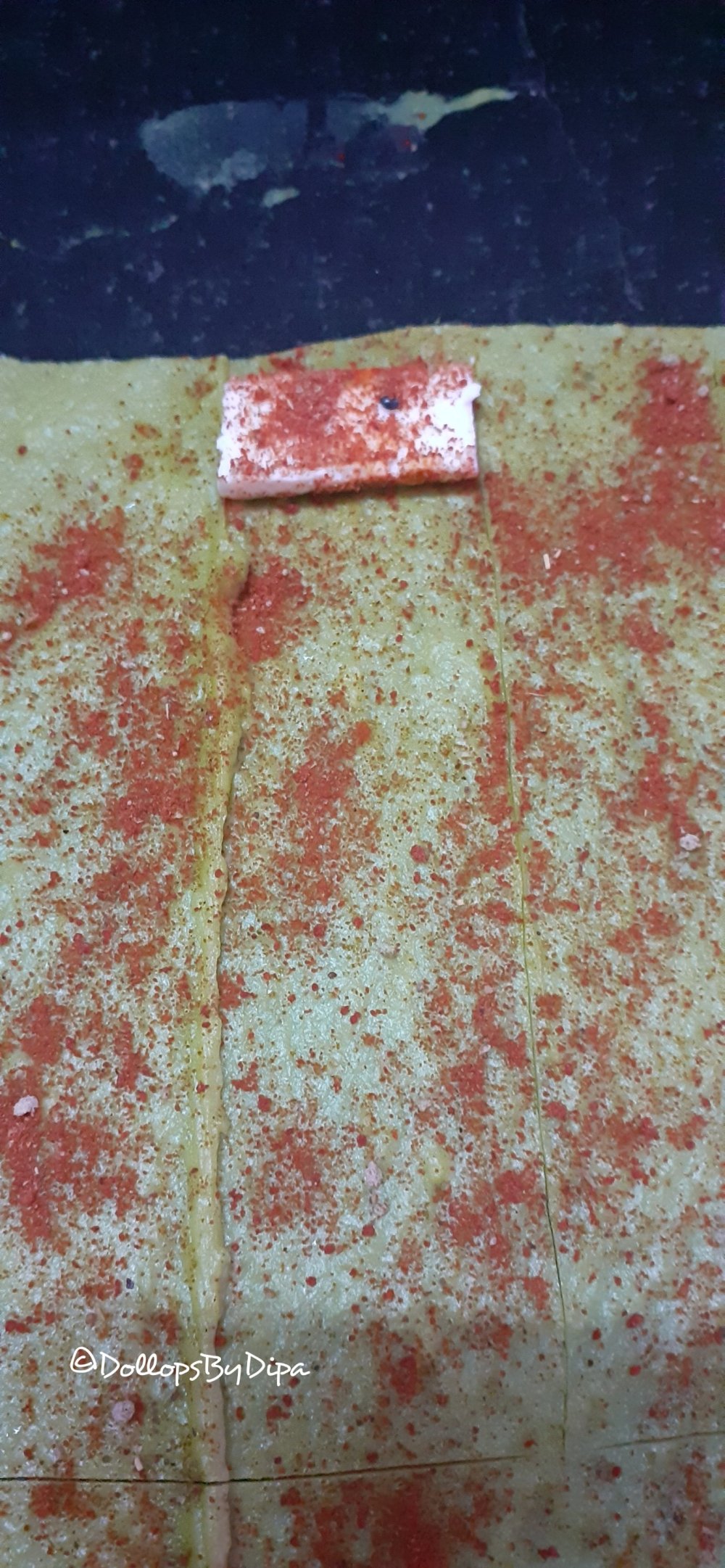 3. Mix all ingredients of spice mix. Cut cottage cheese into small strips or of the size of your roll. Rub all strips in the spice mix and keep aside.