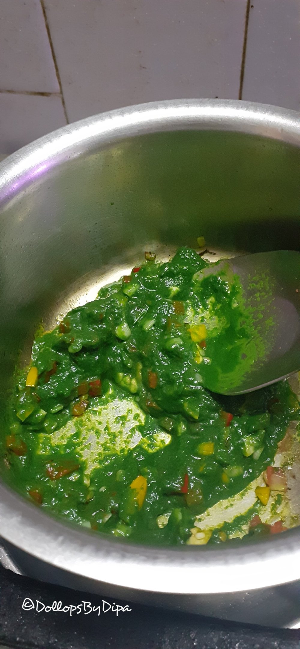 3. Then add spinach puree in it, mix well and saute for a few seconds.