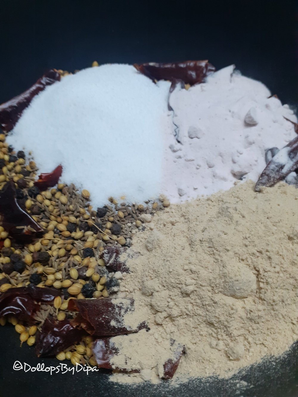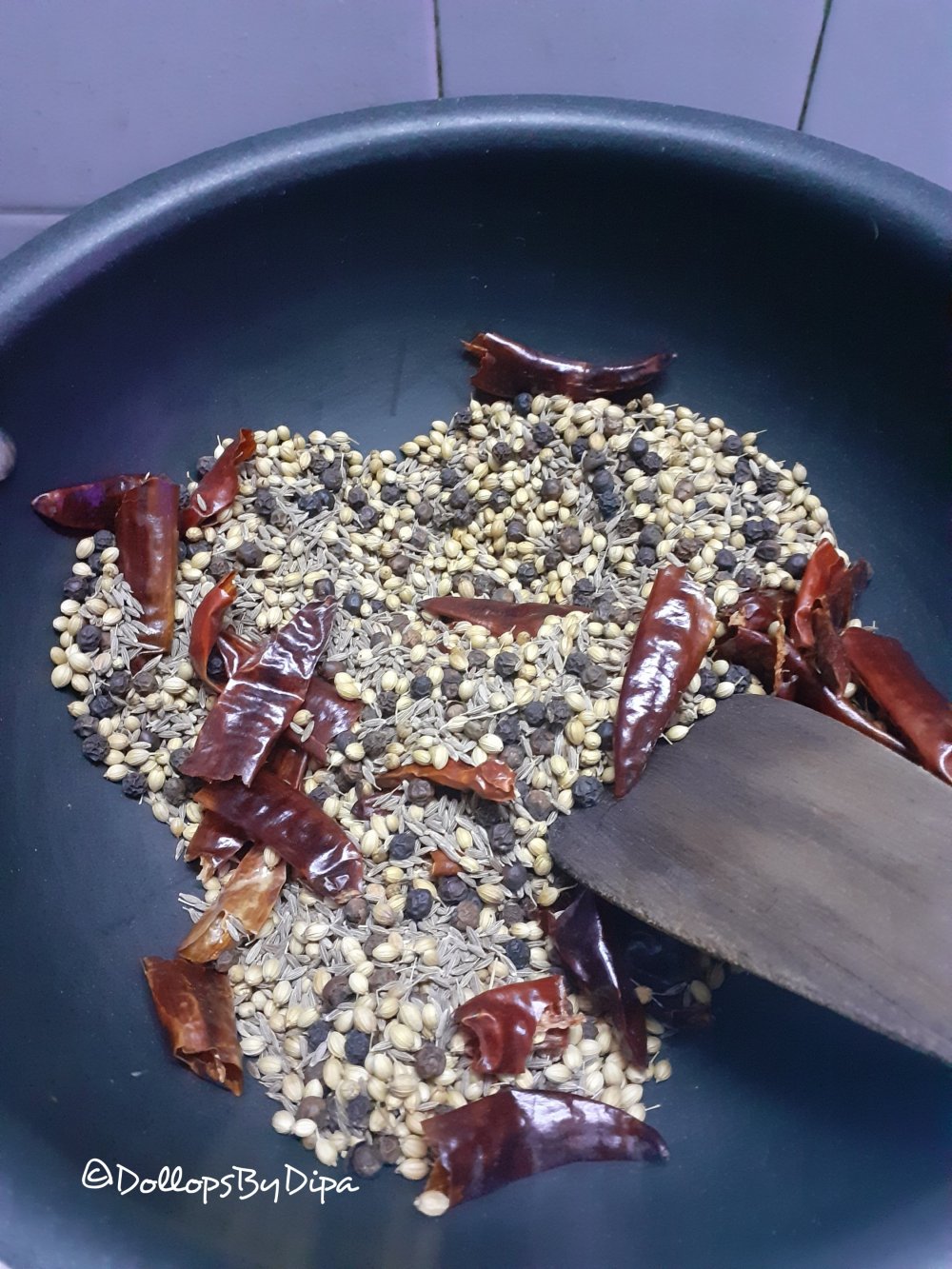 1. Remove stems and seeds of dry red chillies. Dry roast cumin seeds, coriander seeds, black pepper and red chillies on a slow flame.