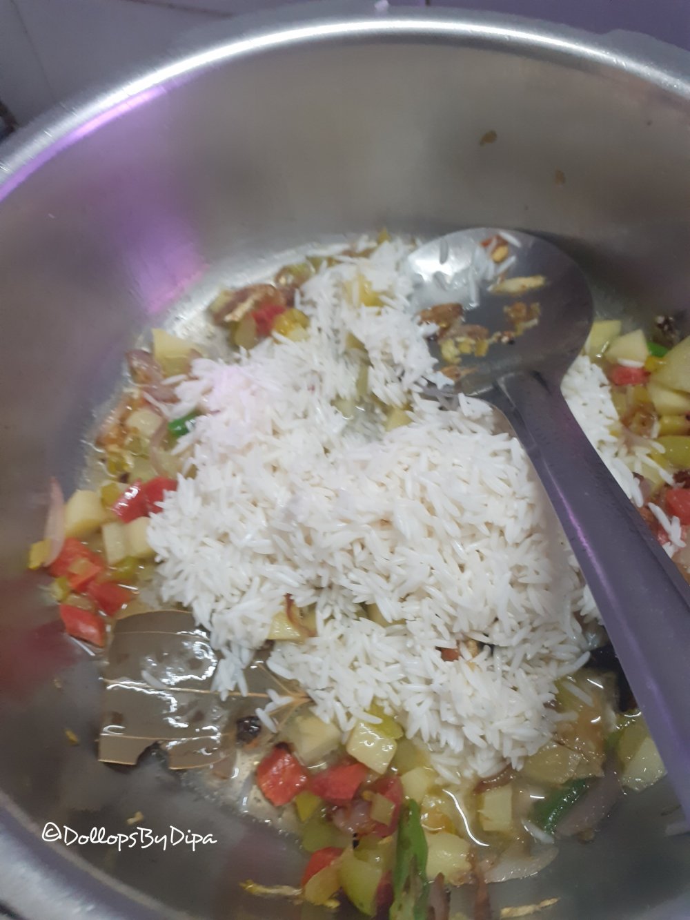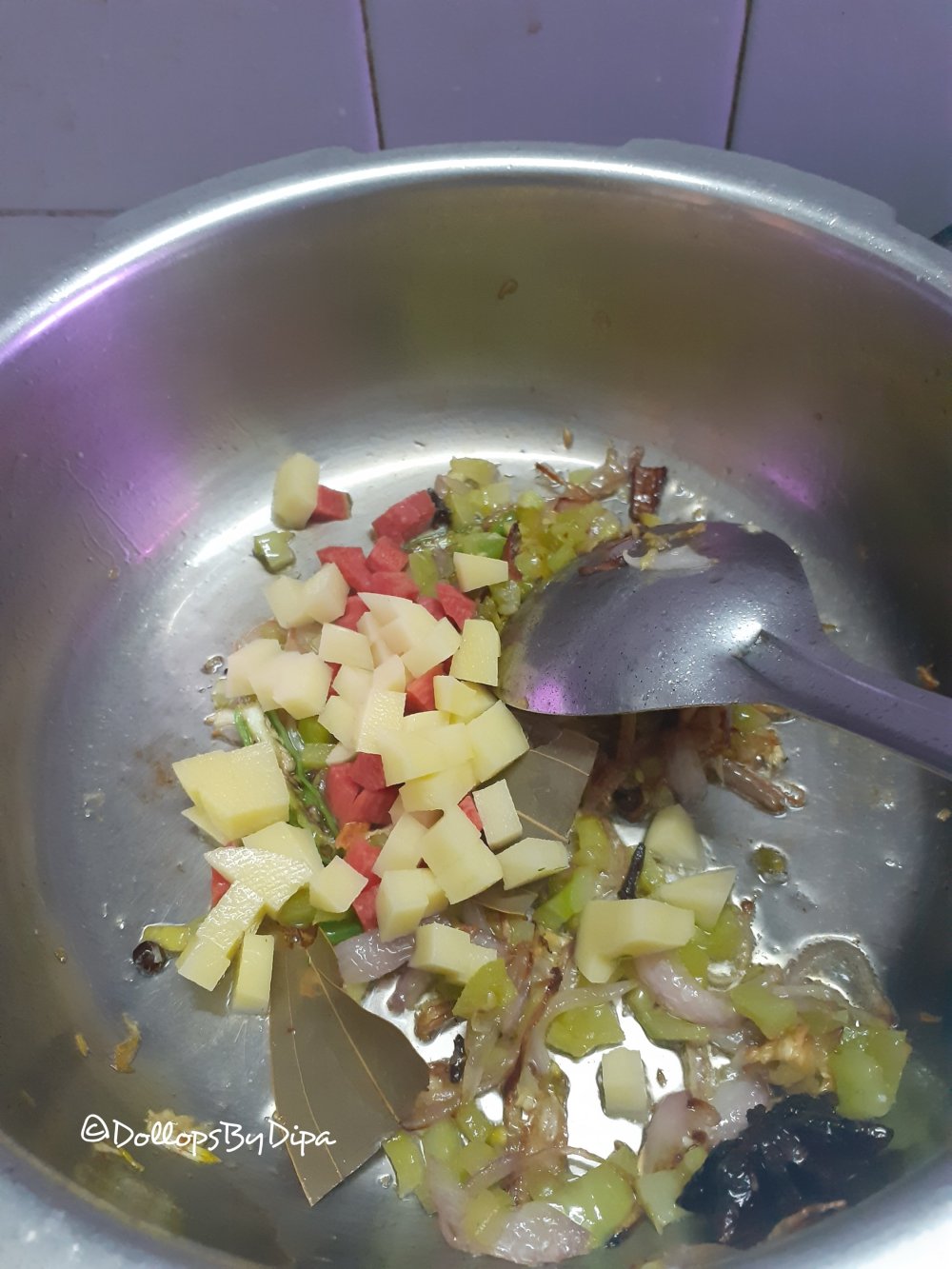 4. Add carrots and potatoes and saute for a while. Then add soaked rice and mix carefully with a light hand.
