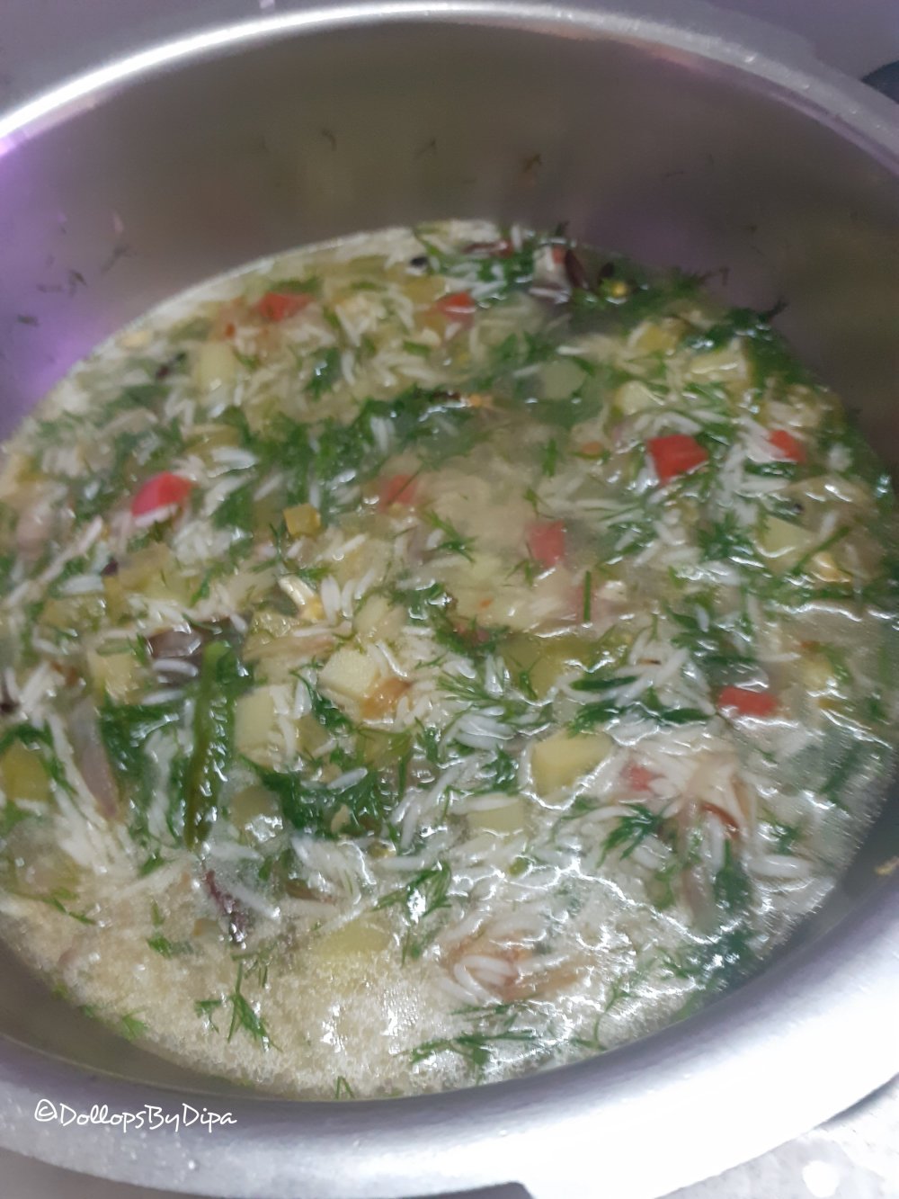 5. Now it’s time to add dill leaves, mix well and add 2 cups of water (1:2 ratio ) and salt, mix well and pressure cook it for 2 whistles on a medium flame.