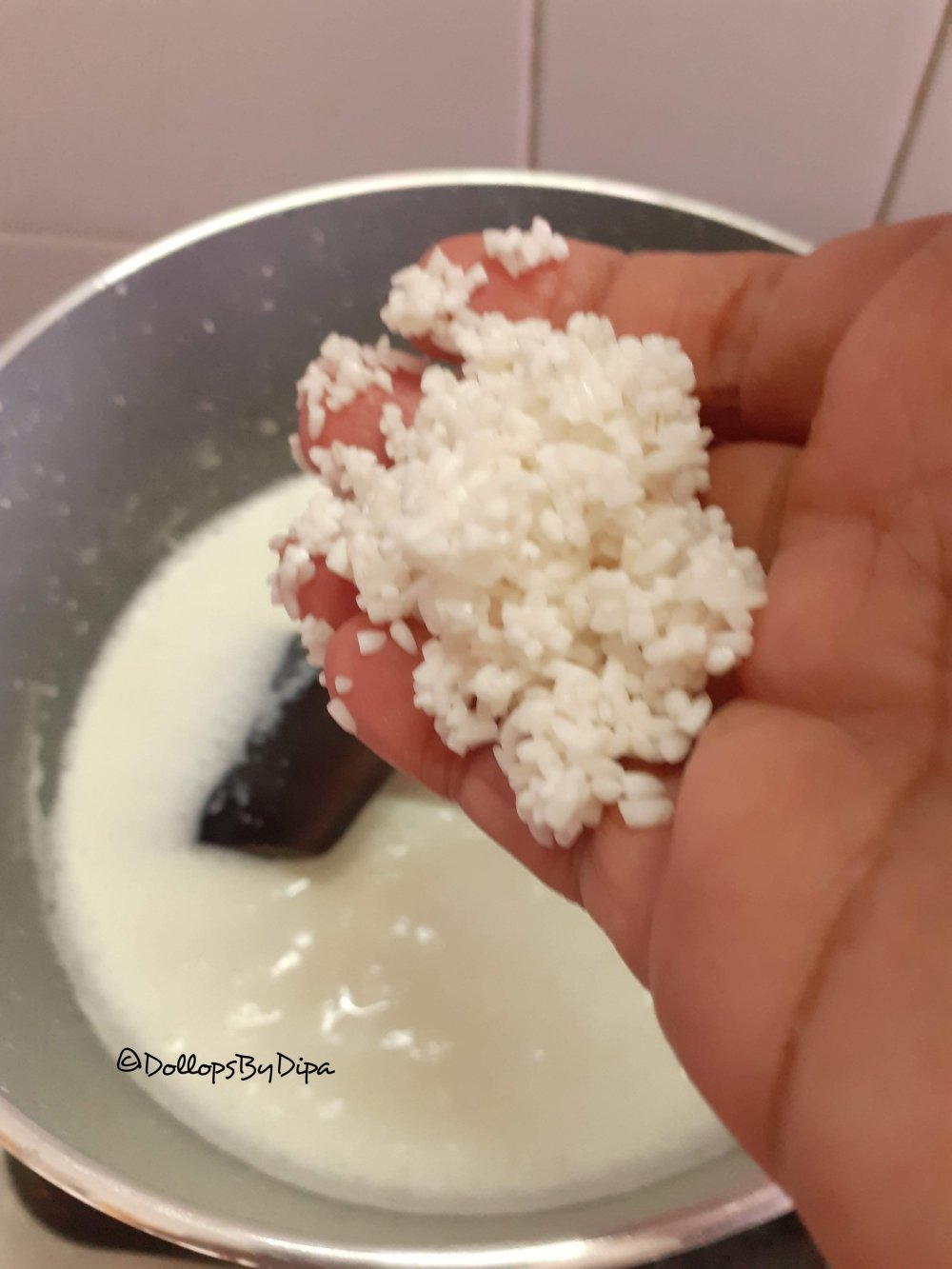 3. After 2-3 minutes, add soaked rice and let the rice cook in milk on low flame. Stir occasionally.