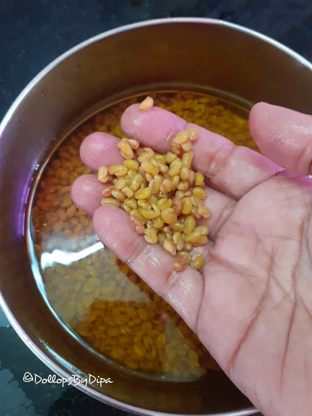 1. Wash and soak fenugreekseeds in hot water for couple of hours. Then pressure cook it. Once it is cooked, drain out excess water and rinse it water, so the bitterness of fenugreek seeds cuts down.