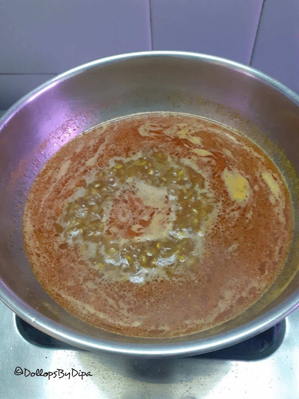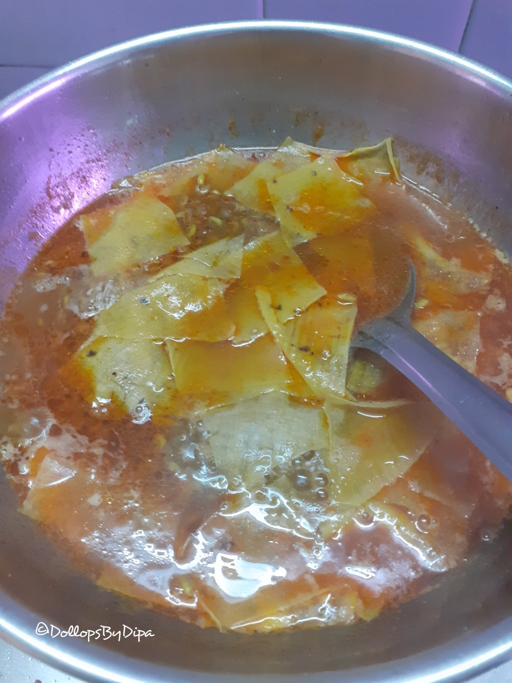 4. Once it starts boiling, cut the papad into pieces, add them and mix. After 1-2 minutes ,slow down the flame , half cover the vessel with the lead.