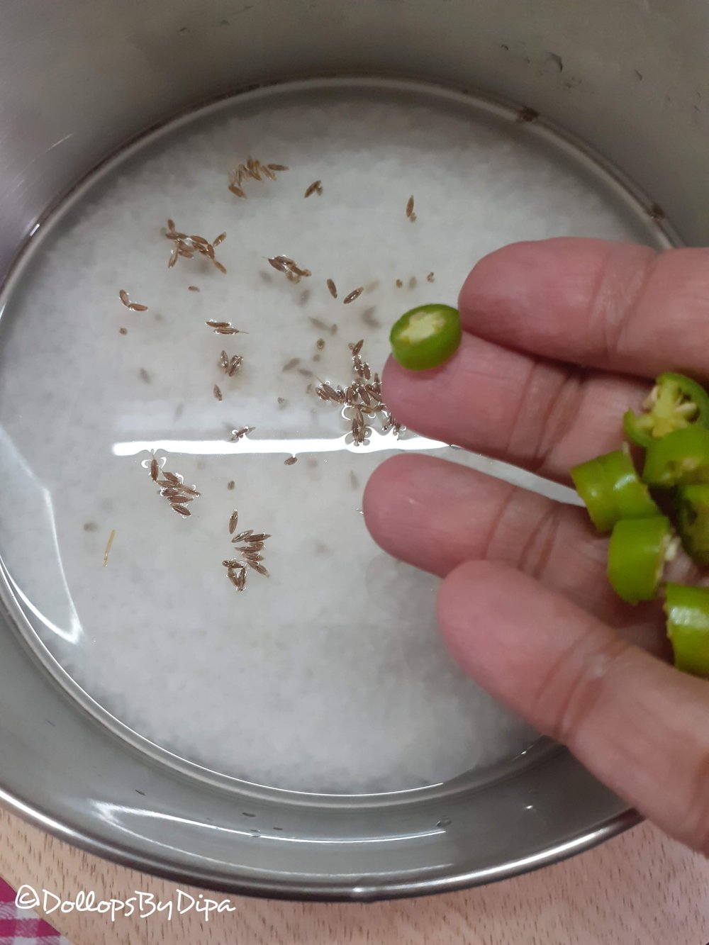 2. After 15 minutes, add salt, cumin seeds, green chillies and water and pressure cook it for 3-4 whistles.