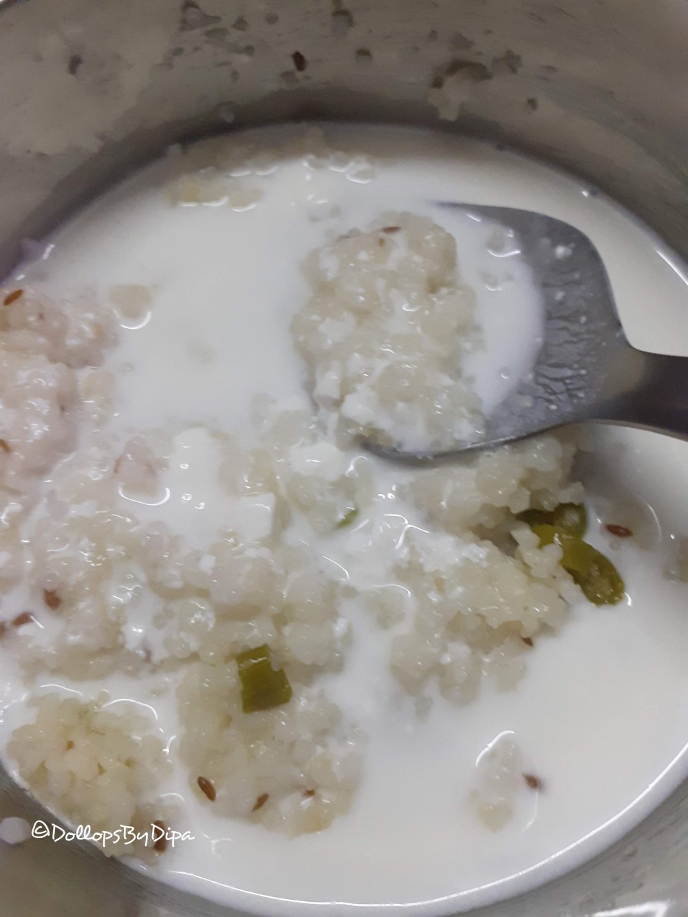 3. Once the steam is realeased , remove it from cooker, whip the curd and add into it. Add some water too, mix well.