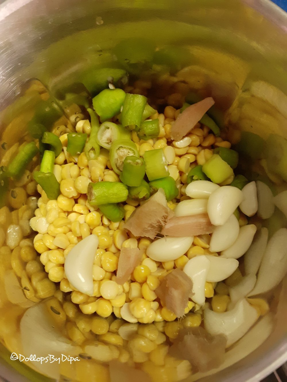 2. After 5-7 hours, when dal is soaked properly, drain out all the water. Then transfer the dal to the mixer jar, add green chillies, garlic and ginger to it and graind it into coarse paste without water. If needed add 2-3 spoons water.