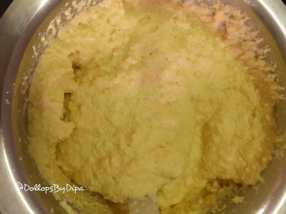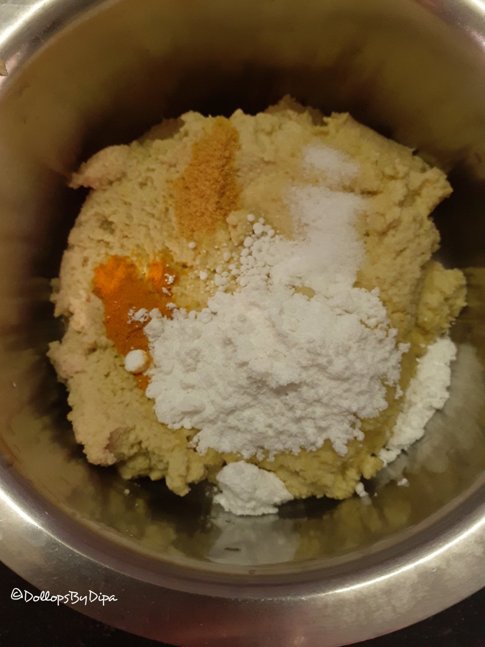 8. Then add 1/4 cup water ( 2 cups of crumbled dhokla : 1/4 cup water), powdered sugar and salt to taste.