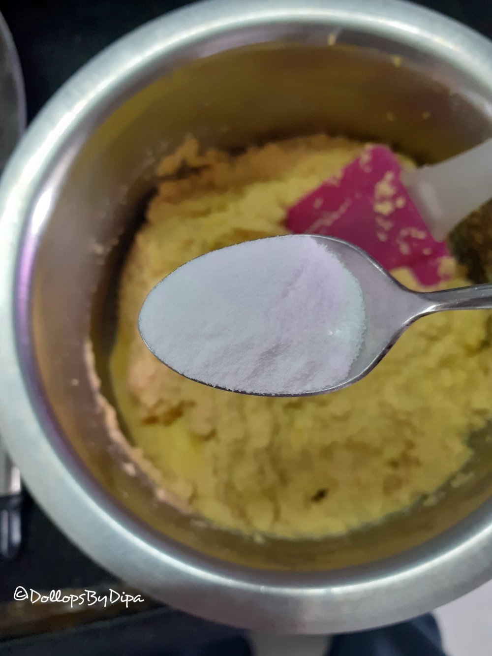 4. Add water to steamer and turn off the flame. Once the water heats up, add fruit salt to the batter and mix well. Transfer this to the greased plate and place this plate in the steamer, cover and cook for about 15 minutes.