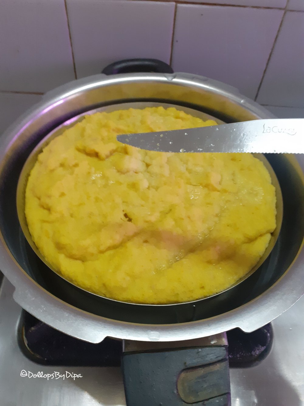 5. Check with a knife if the dhokla is cooked or not. If the knife comes out clean, it is cooked. Turn off the flame and remove the plate.