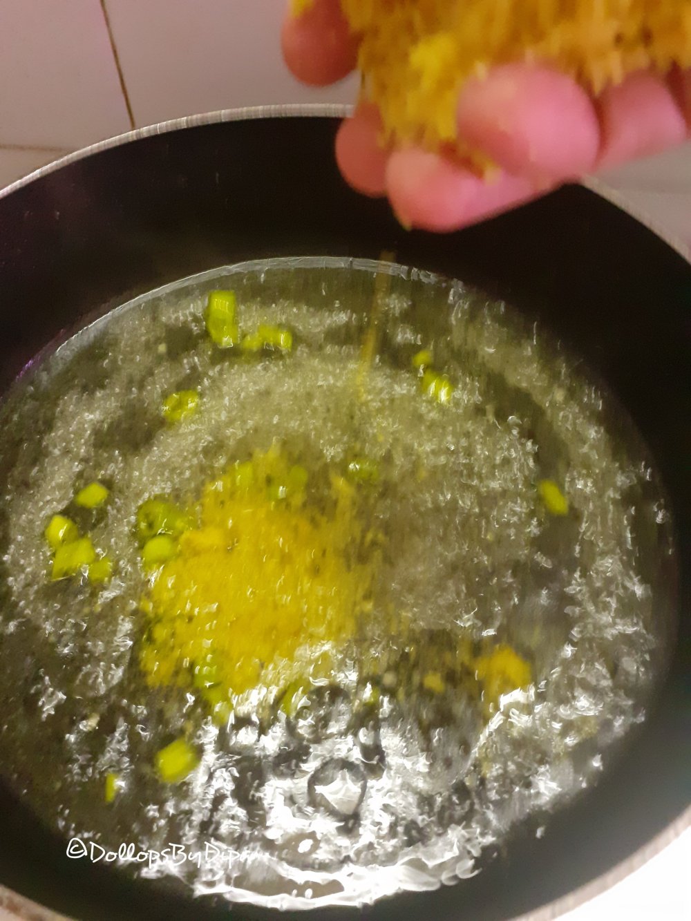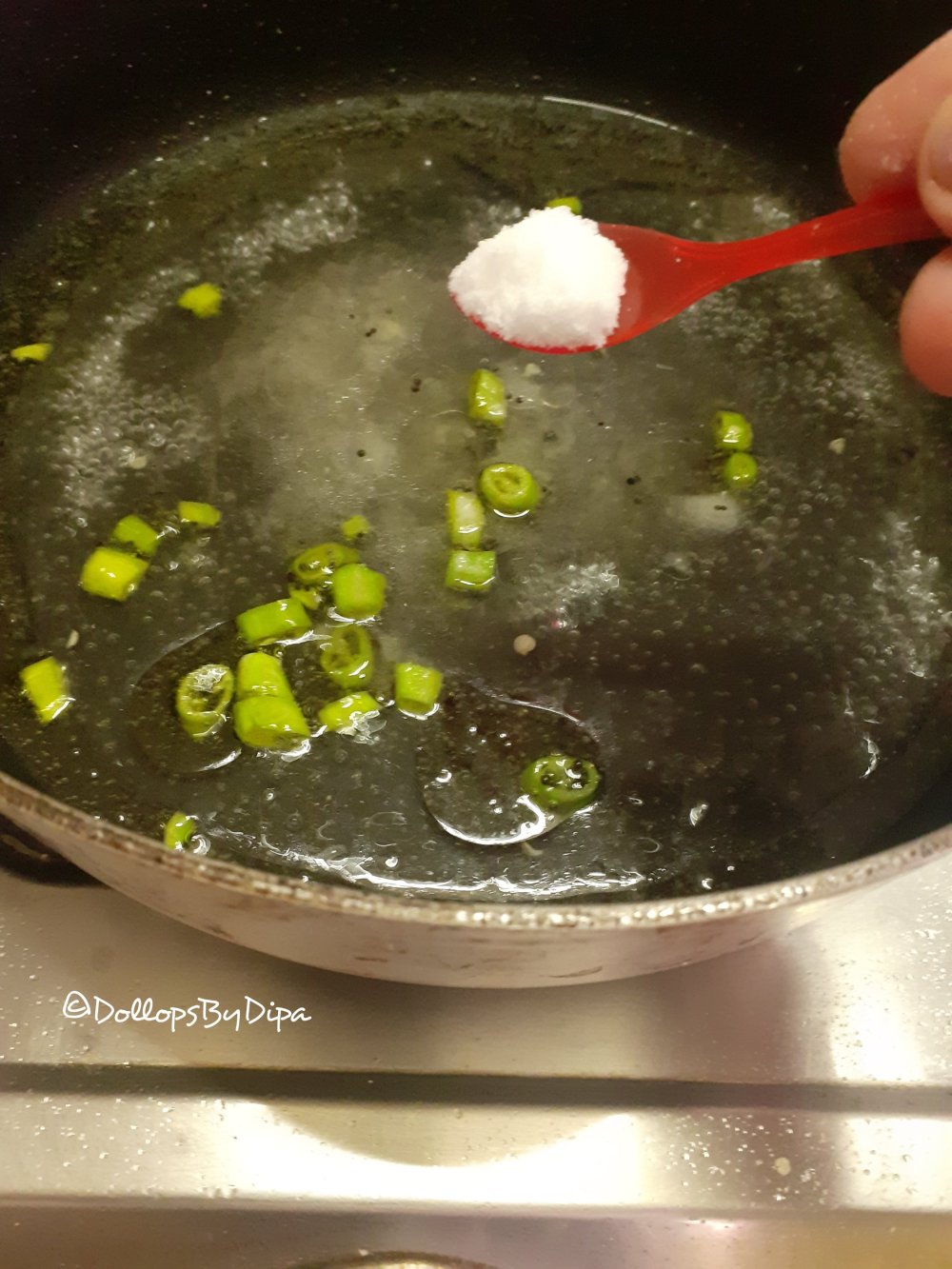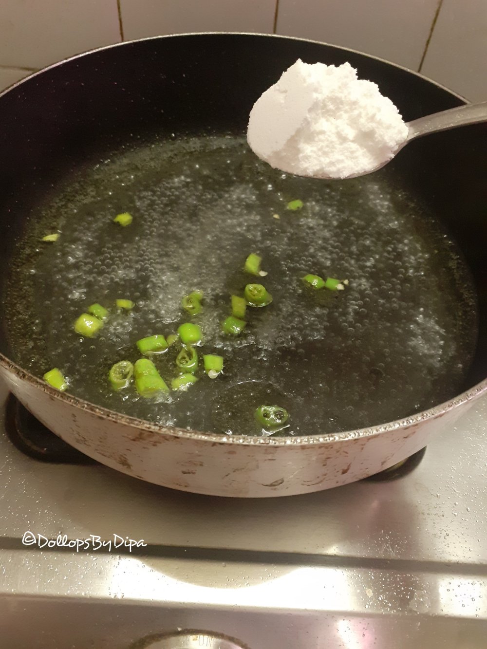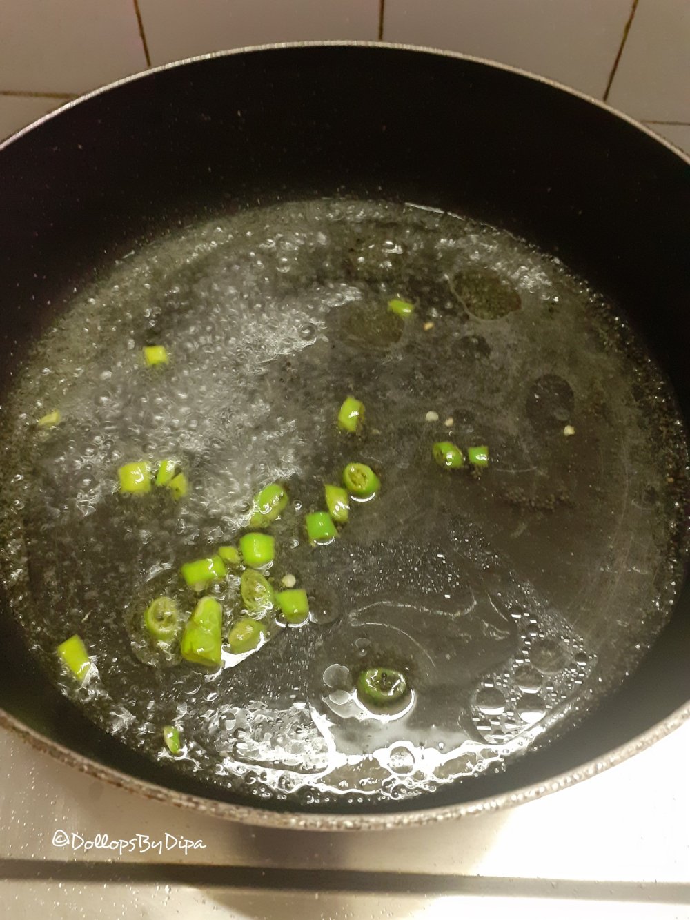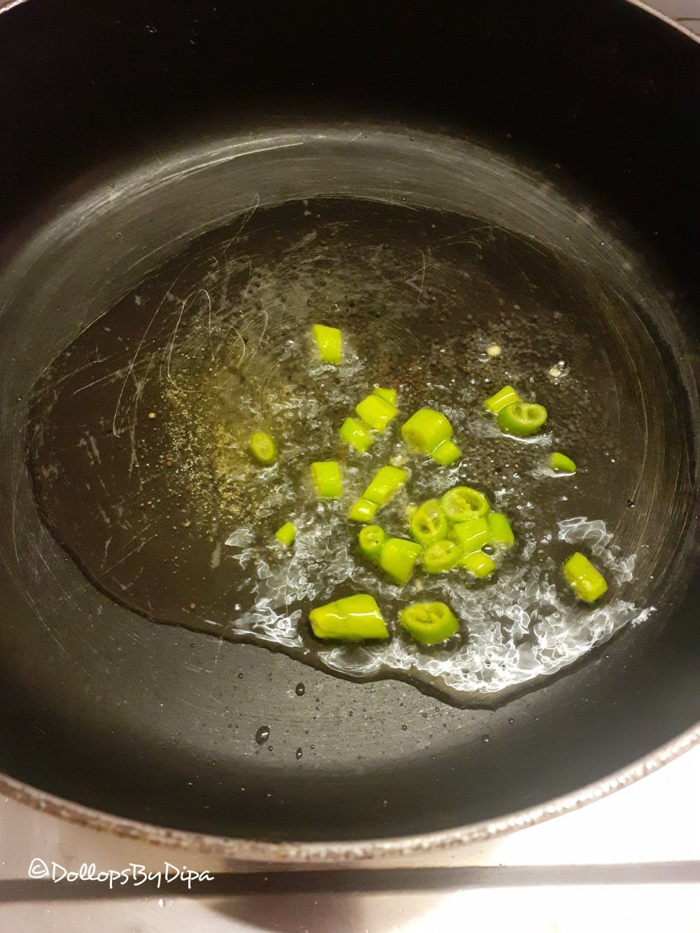 7. Heat the oil, add mustard seeds, once the mustard seeds splutter, add assfoetida and green chillies.