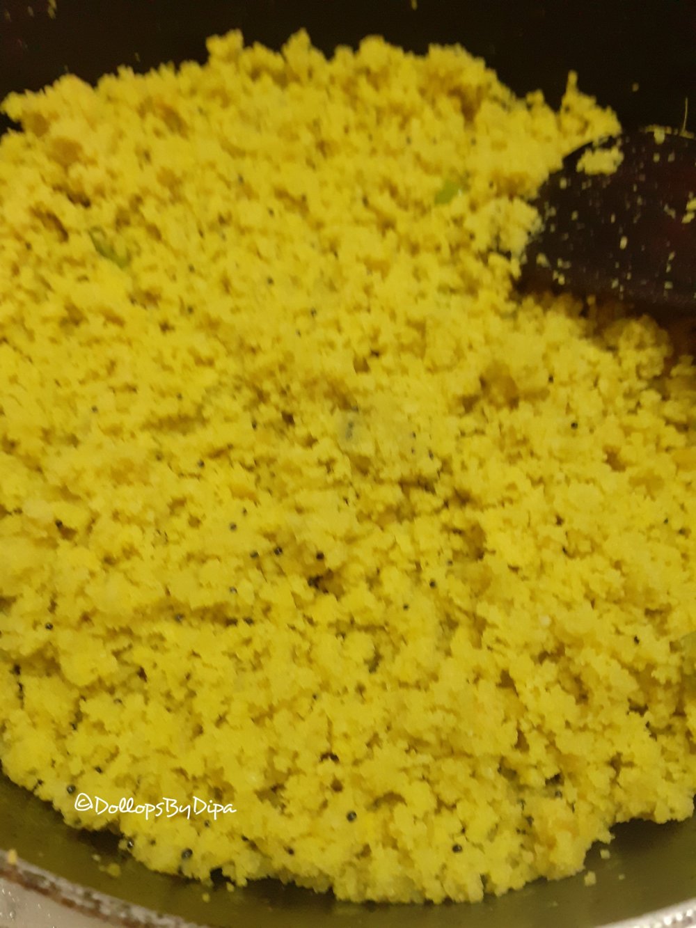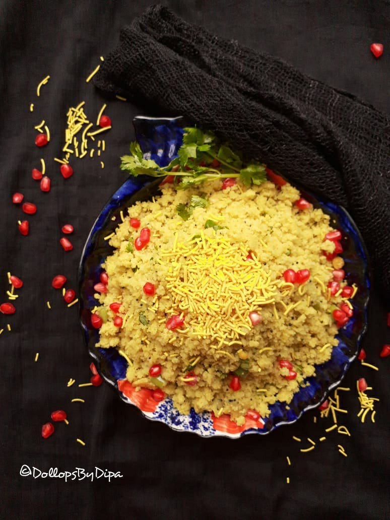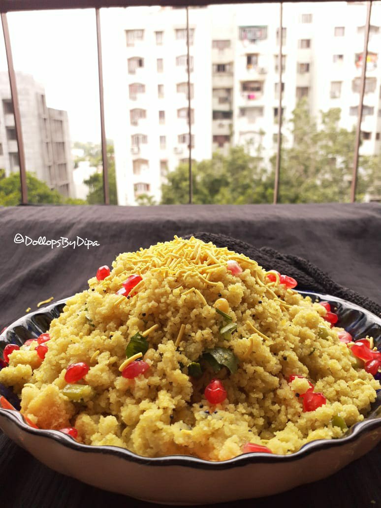 Sev Khamni is a delicious snack from Surat – Gujarat, made of crumbled dhoklas, tempered with garlic chillies etc and served and garnished with besan sev and pomogranate seeds.