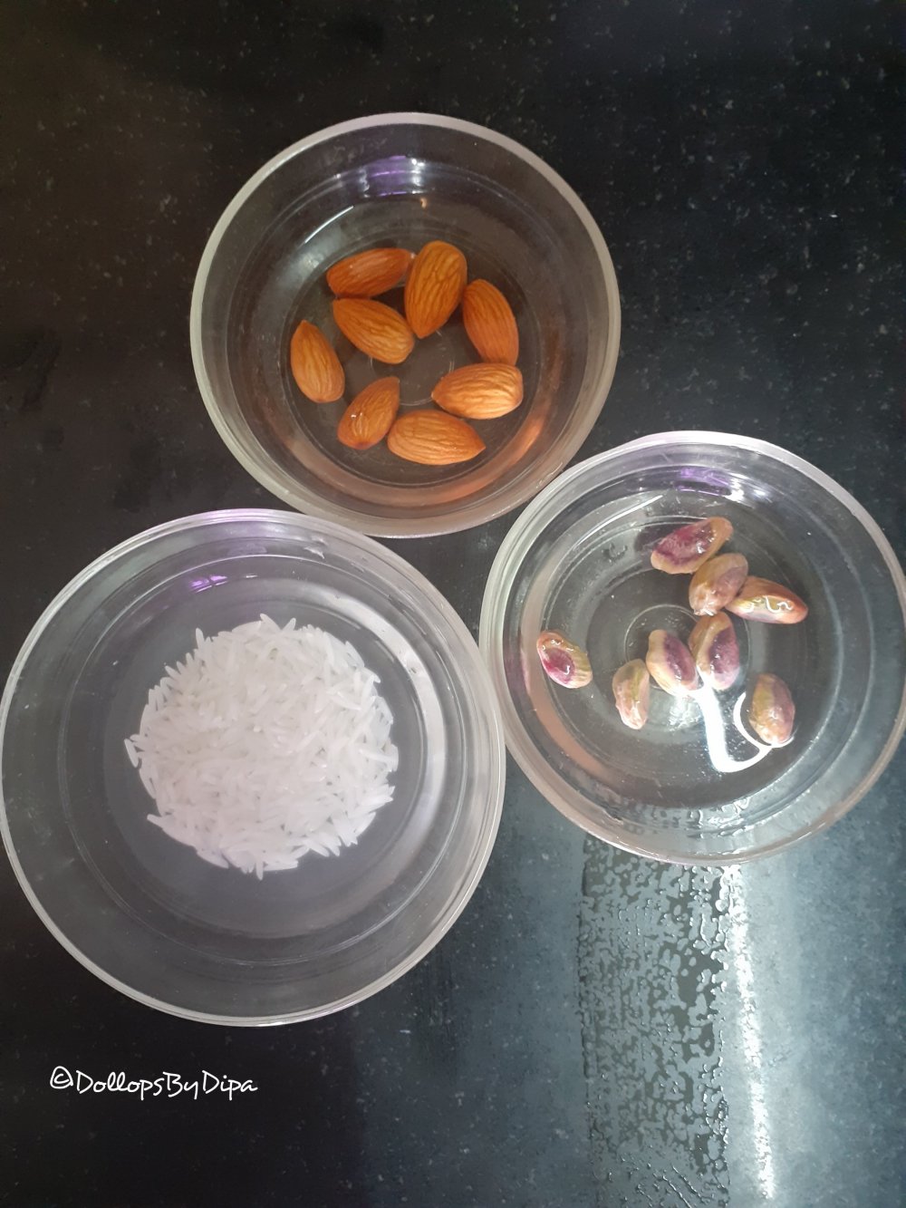 1. Wash and soak the rice for 5-10 minutes, soak almonds and pistachio in hot water.