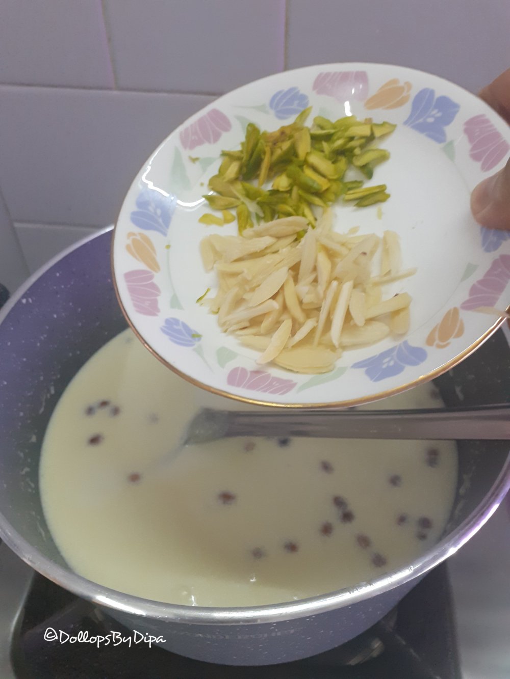 6. Now add sugar, chironji, almonds and pistachio. Let it cook more for 5-7 minutes.