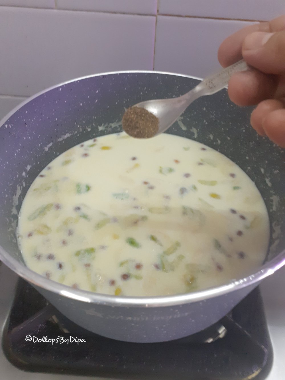 7. Add cardamom powder and nutmeg powder. Turn off the heat after 2 minutes.