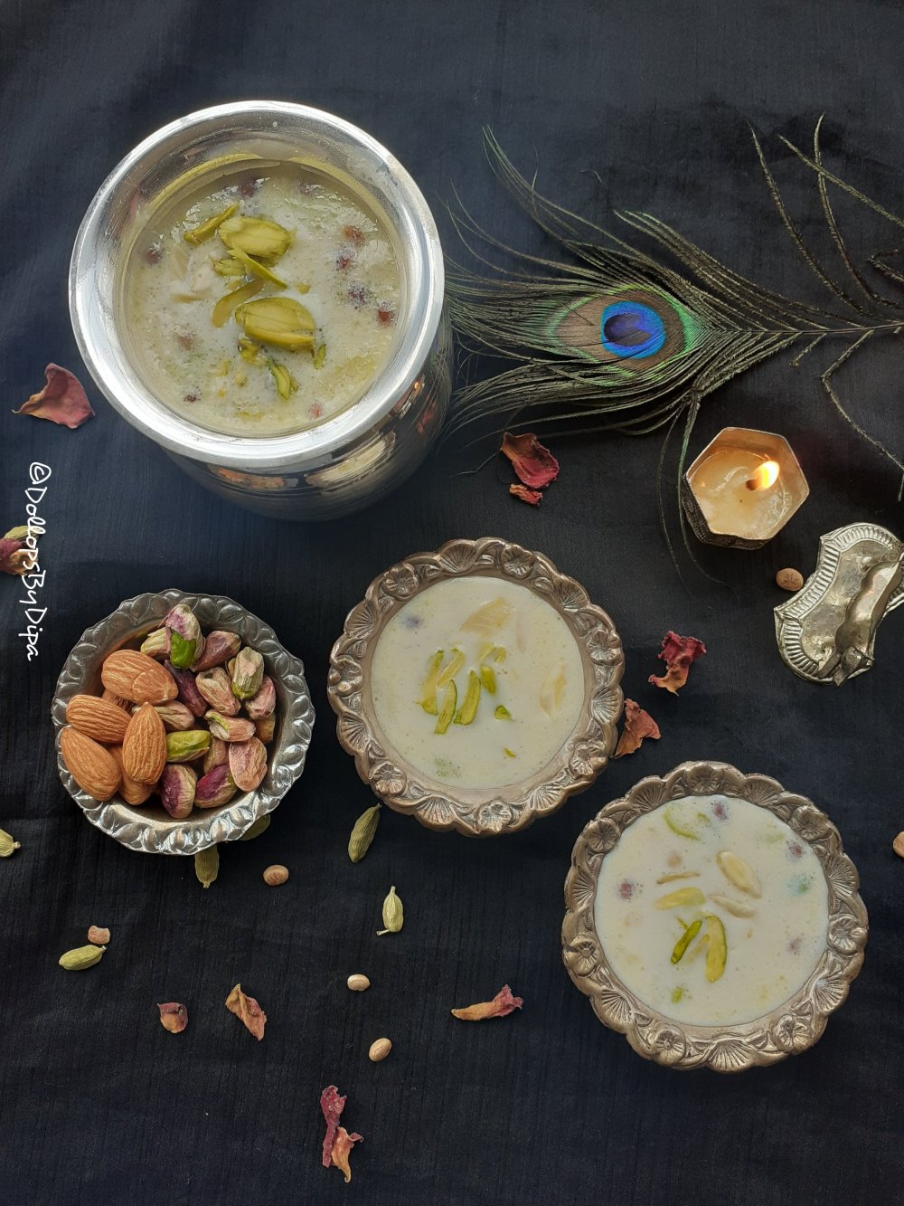 Doodhpak is an Indian sweet which originates from Gujarat. This traditional sweet is served and tastes best with poori ( puffed and fried Indian bread). Doodhpak means “cooked milk”. It is similar to “kheer”(rice pudding) but quantity of rice is lesser than kheer and also it not thick like kheer but still it is rich and creamy. Cooking milk on low flame makes the milk thick, creamy and rich.
