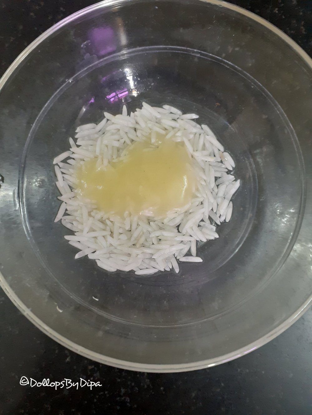 3. Once it starts boiling, turn the flame on low. Drain out water from rice and add ghee and mix well. Stir occasionally.